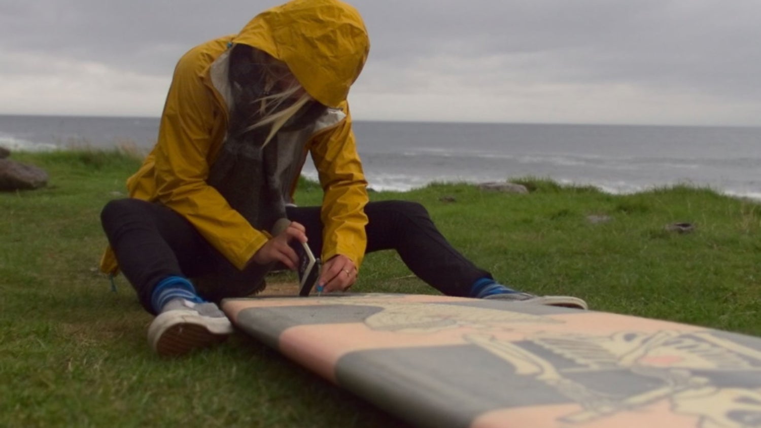 Filippa Edghill installing a fin on a surfboard featuring her artwork as a swell builds in Lofoten. After being skunked for waves for weeks on the trip, the fickle Norway coastline finally had served up a solid dose of swell and waves. For a few hours the point was firing, then a gusty onshore squall moved in and the window closed again.
