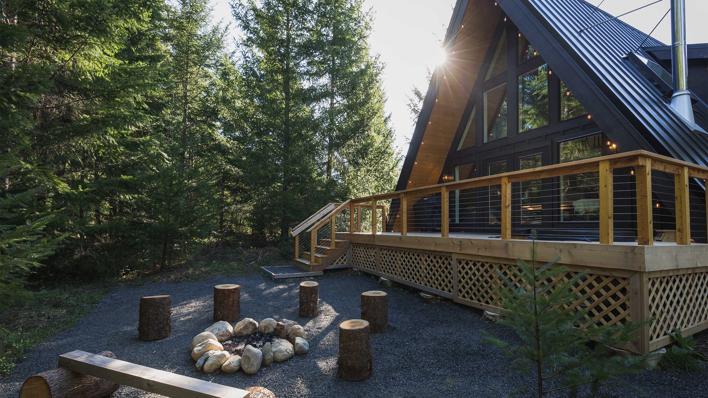 Those who love A-frames will adore this newly built, one-bedroom A-frame cabin (from $313) in Packwood, Washington, less than 20 minutes from the Stevens Canyon entrance into Mount Rainier National Park. The place sleeps up to six in a sleeping loft and pull-out couch and the kitchen is spacious and well stocked. At night, soak in the built-in cedar hot tub on the back deck, roast marshmallows in the firepit, or gaze at constellations from the front deck.