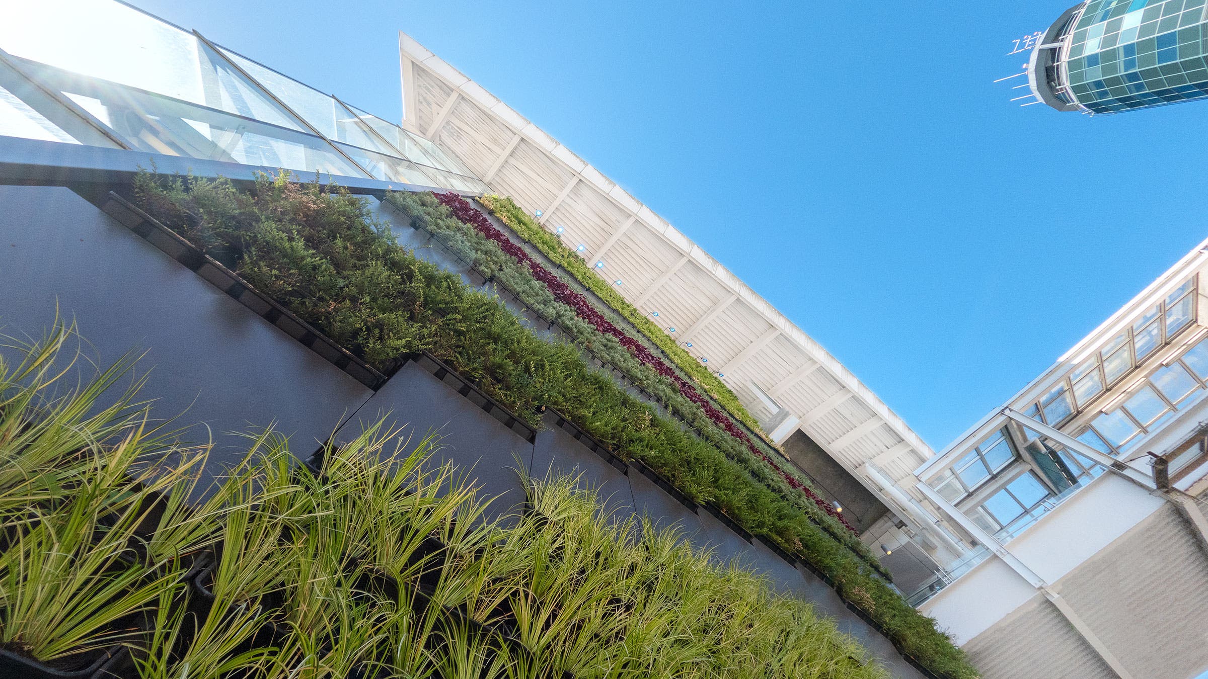 For most passengers headed through Vancouver Airport, their first introduction (or last farewell) to British Columbia is YVR’s Chester Johnson Park, located directly adjacent to (and underneath) the Canada Line train station. The park is designed to feel like an urban shoreline, with rock-lined paths, native trees, driftwood benches, and a large wooden sculpture—the Musqueam Welcome Figure—curving throughout its length. It’s also home to the Green Wall, a 17-meter-high vegetated art installation made up of, at last count, 27,391 individual plants.