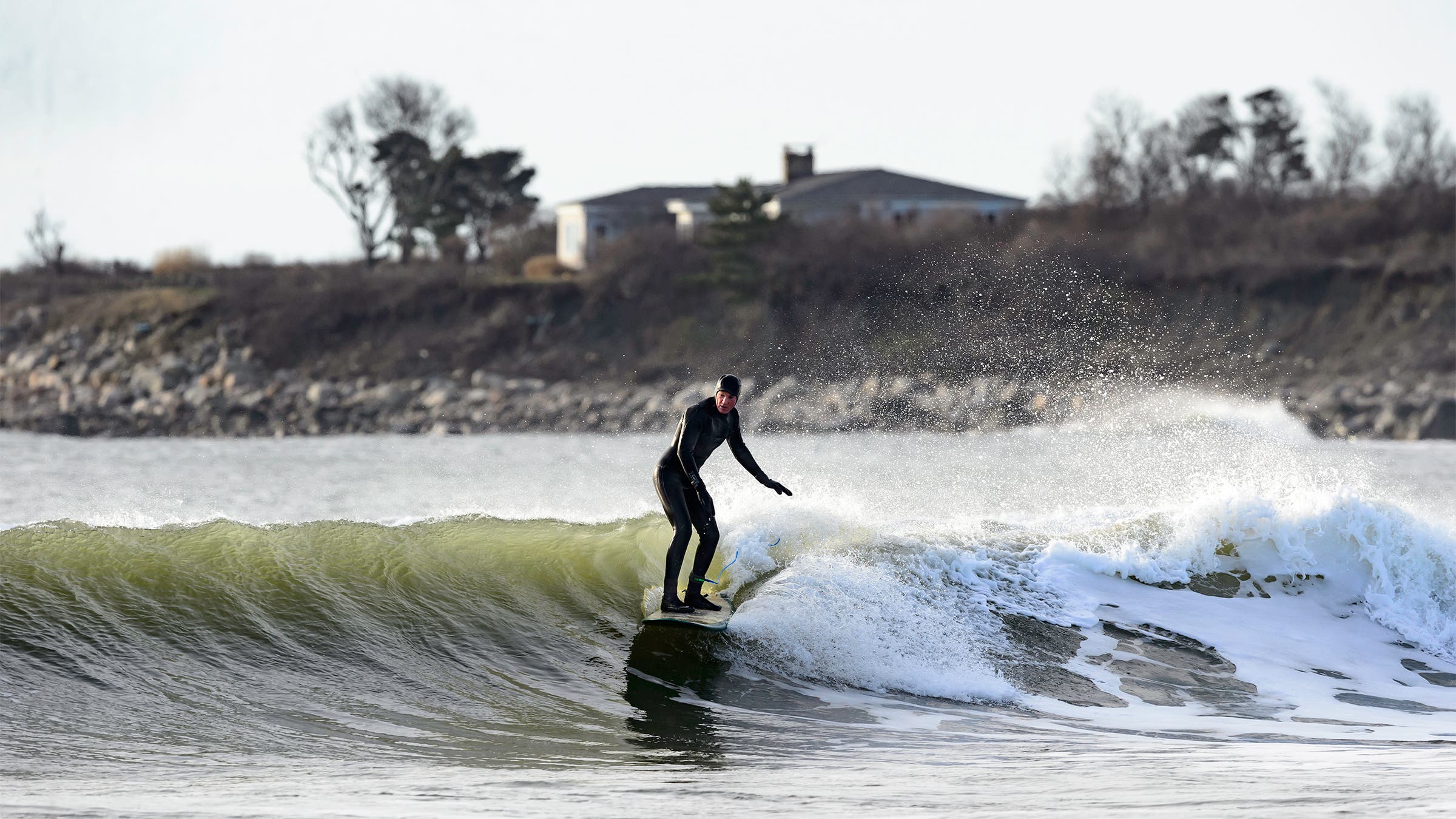 It was fitting that this would be my final East Coast wave, because it had all the trappings of a final stage from a video game. The one-to-two-foot swell was dying as I pulled into the state. I began scouring the coast around the town of Rockport, 40 miles northeast of Boston, but couldn’t find anything. Someone had told me that if there was going to be a wave anywhere, it would show up on the far side of an island, a quarter-mile offshore from Brace Cove, just north of the adjacent city of Gloucester. It was a long, slow paddle, followed by a climb across the poison ivy–invested island, but sure enough, there was a tiny wave breaking over some barely submerged rocks. I managed to get a few without losing any skin (or fins) and paddled all the way back. It was an epic journey for tiny, gutless waves, but I was grinning from ear to ear the whole way back. I wish I had known about Good Harbor Beach, a few miles north, which is nicely spread out and has plenty of peaks.