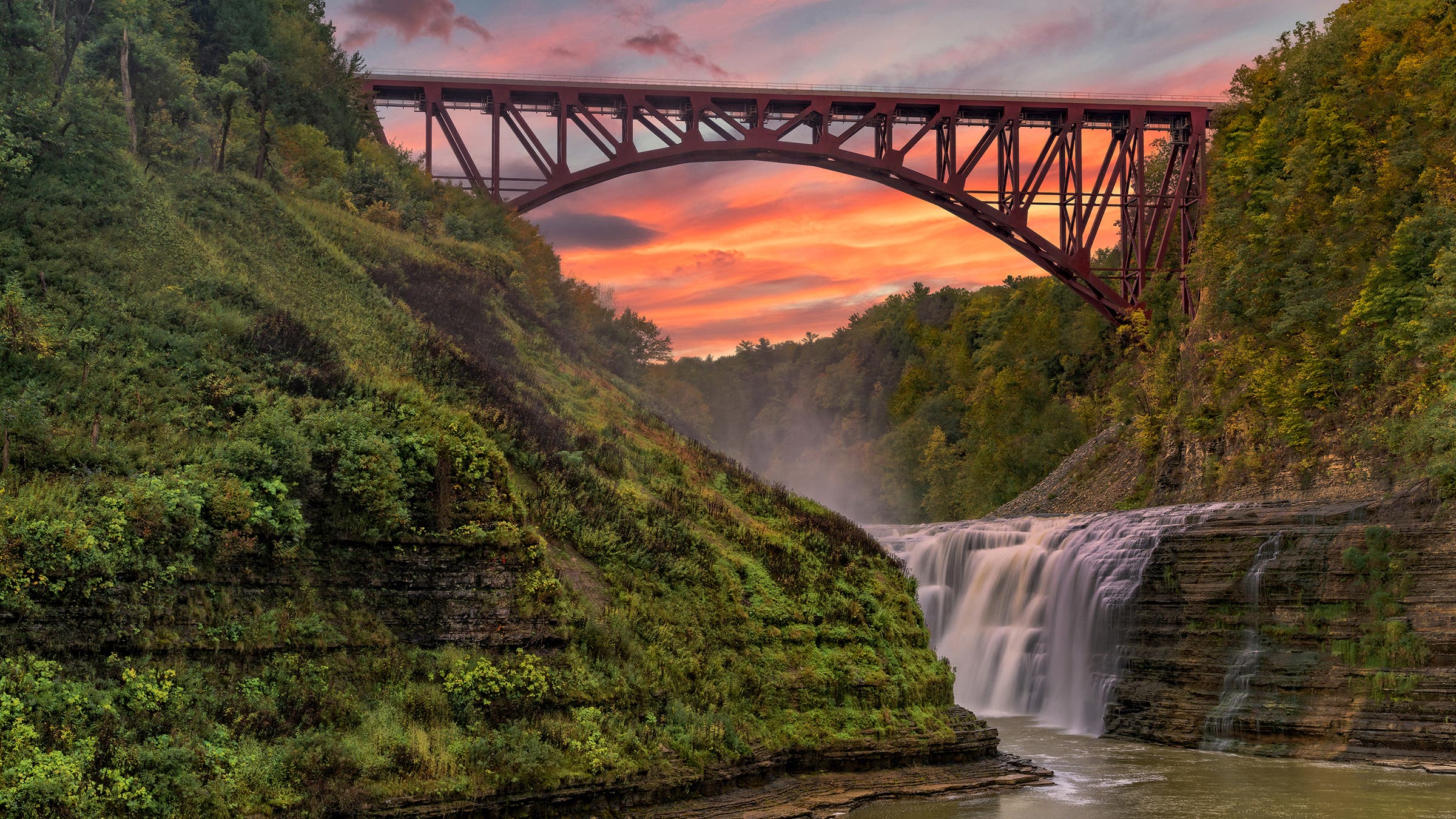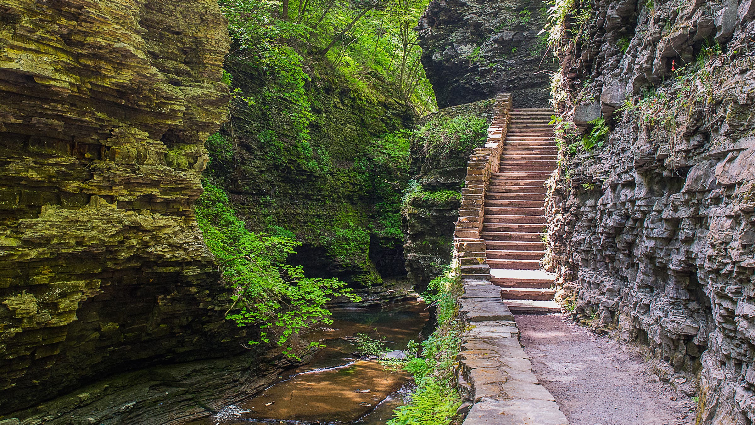 Waterfalls plunge at nearly every turn in Watkins Glen State Park, with 19 of them cascading down Paleozoic-era sedimentary rock. The Gorge Trail traverses through the thick of it. This route, open from late spring to late fall, packs in 832 stone steps, has sections that duck under Rainbow Falls and the Cavern Cascade, and features an 85-foot-high suspension bridge—all in a quick 1.5 miles.