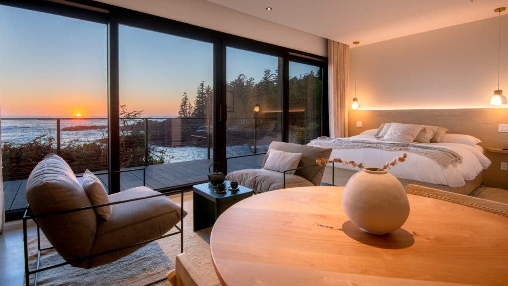 After I spent hours braving the elements, the Nami Project was even more inviting. Each room has heated floors, plus a private sauna and hot tub, and the oceanfront common area boasts a gas fireplace, two sunken cedar hot tubs, a cold-plunge tub, and lounge chairs set beneath outdoor heaters.