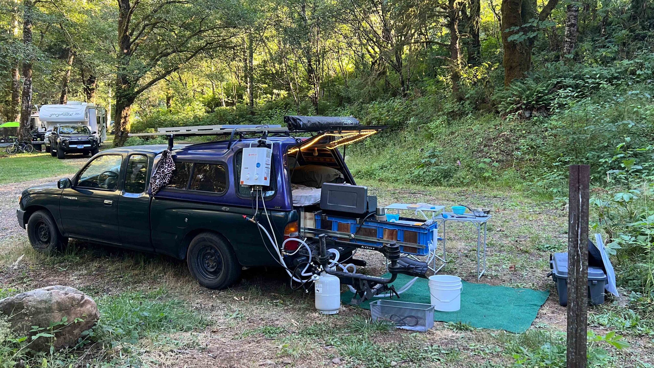 The truck I ended up buying and which my father and I turned into a tiny but well-appointed camper is basically me personified. A well-loved, slightly battered, but still-in-great-condition 1998 first-generation Toyota Tacoma. Shortly after acquiring the truck from my brother (who acquired her from a family friend who’d bought her new), I sourced a pearl purple high-top camper shell, and the vision was complete. Like some kind of utilitarian Mardi Gras float, Queenie was born.