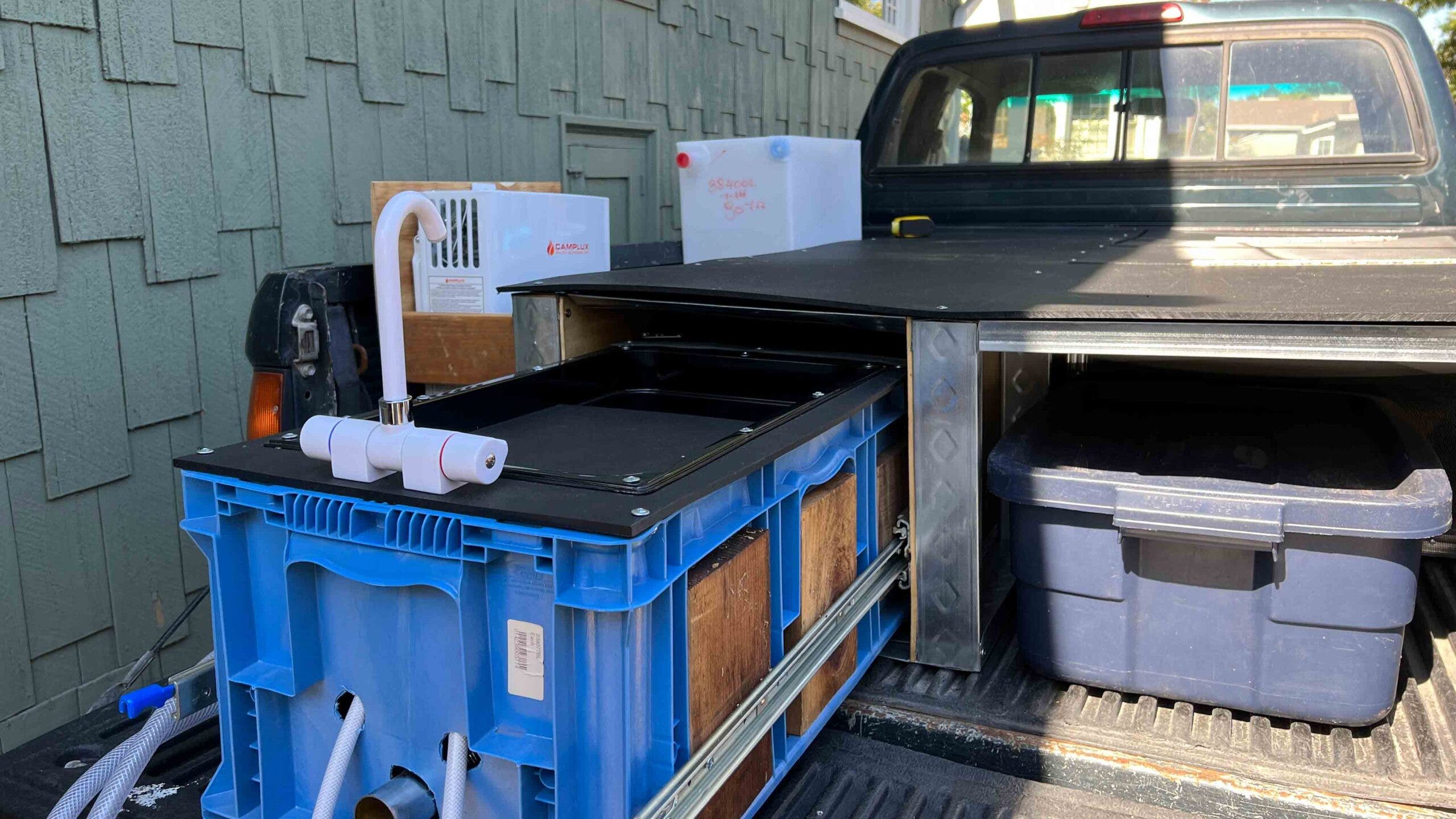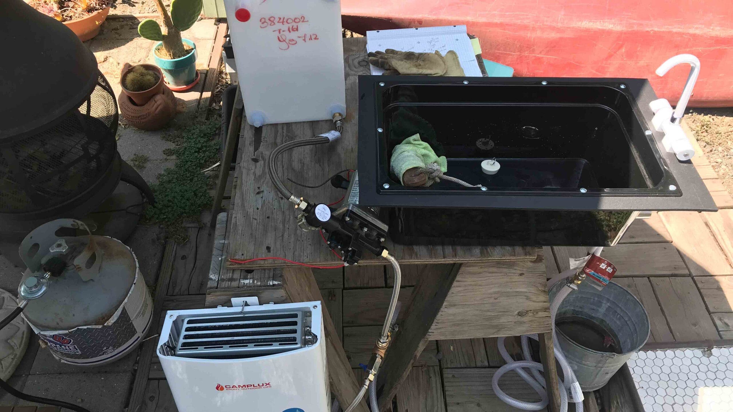 Having running water was a big dream of mine: If I was gonna make it on this journey, I needed a convenient, doable way to be able to shower and generally clean up. So I ordered a 10-gallon water tank, a collapsable marine faucet, and a Camplux on-demand water heater, and started researching what kind of tubing we needed to run hot water.