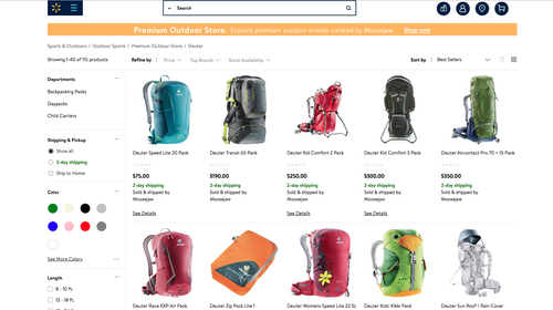 Sure, individuals at the company might have a genuine interest in the mountains—Greg Penner, chairman of the Walmart board of directors, reached the summit of Mt. Everest this summer. But since 2016, Walmart in its race with Amazon has been adding inventory and brands by the thousands through third-party sellers. You can browse $200 handbags and upscale beauty products on the site—something you can’t do in stores. In 2017, Walmart acquired a number of brands: the men’s line Bonobos, hipster women’s clothing site Modcloth, and Moosejaw, a reseller of some of the best brands in the outdoor industry. As expected, Walmart gained access to those and stocked its “curated by Moosejaw” store with nearly 50 different brands, from Black Diamond Equipment to Deuter.