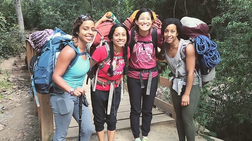 Four women of color clad in climbing gear and heavy backpacks beam at the camera: The image (above) represents far more than a moment among friends. The women had just earned their Single Pitch Instructor (SPI) certifications from the American Mountain Guide Association (AMGA), a small but important step in the advancement of women and people of color in adventure sports.
