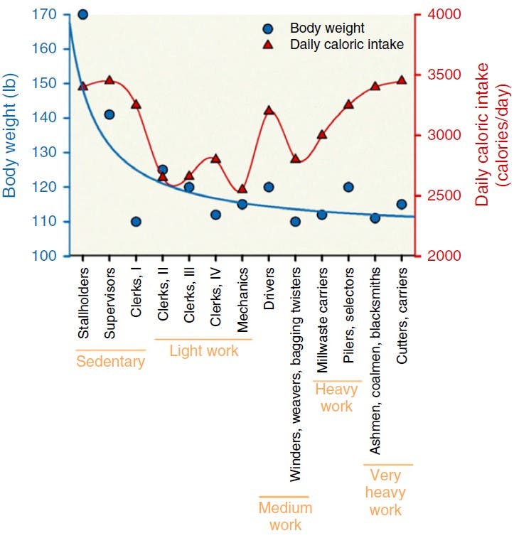 Another famous natural experiment is Harvard nutrition researcher Jean Mayer’s 1956 study of hundreds of workers at a jute processing plant in India. He divided the workers into 13 categories ranging from sedentary clerks and supervisors to cutters, carriers, and blacksmiths doing very heavy physical labor. Then he assessed their weight and their daily calorie intake.