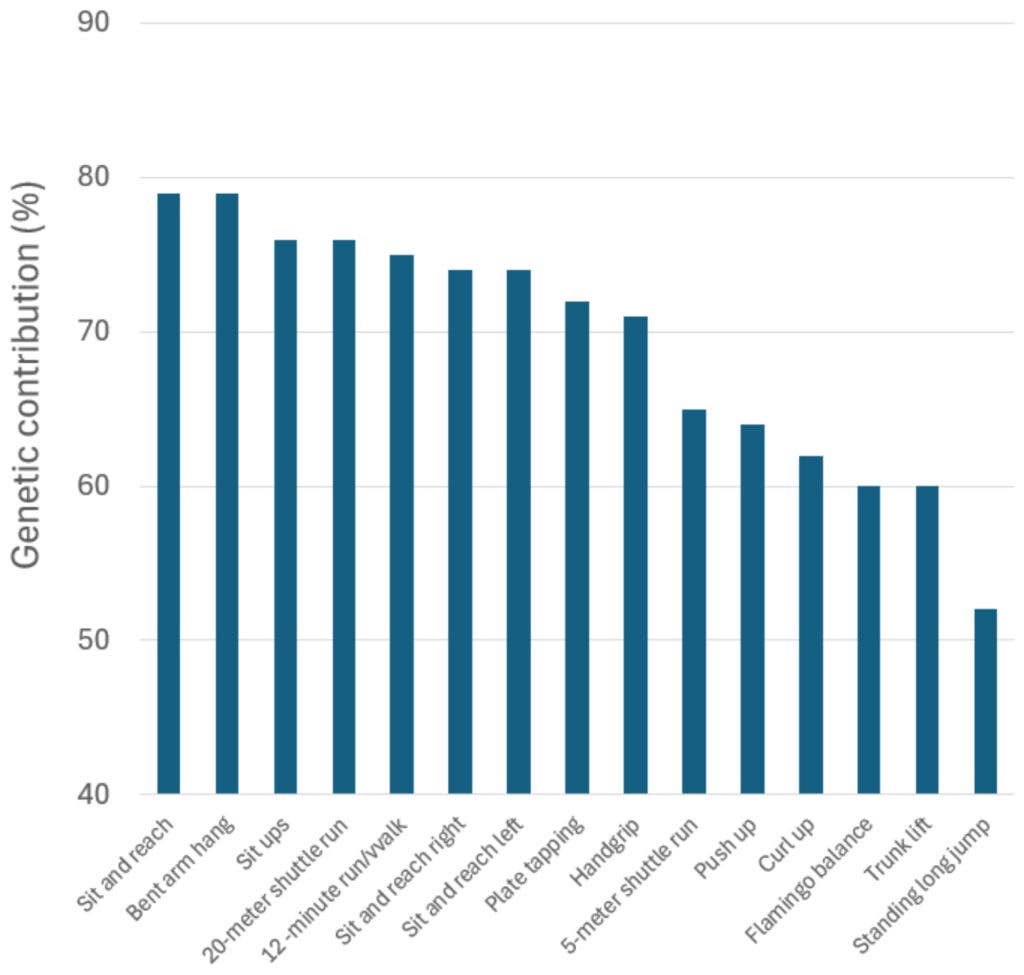 Overall, as you can see from the above graph, genes played a big role in the results, with genetic contributions ranging from a low of 52 percent for the standing long jump to 79 percent for the sit-and-reach flexibility test. According to the researchers, that range of heritability is similar or slightly lower than for height and childhood BMI; on the other hand, it’s higher than the heritability of adult personality and other psychological traits.