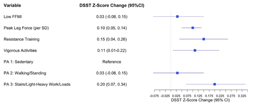 Sure enough, having low FFMI (i.e., low muscle mass) has no significant effect on cognitive scores, while peak leg force, a measure of strength, does have a significant benefit. What’s interesting to me is that the effect is even stronger for the next category, which is those who reported doing resistance training at least once per week. (The other categories below, like Vigorous Activities, include a mix of resistance and aerobic activity, so it’s hard to draw any conclusions about strength or muscle from them. Suffice it to say that aerobic exercise is also good for the brain.)
