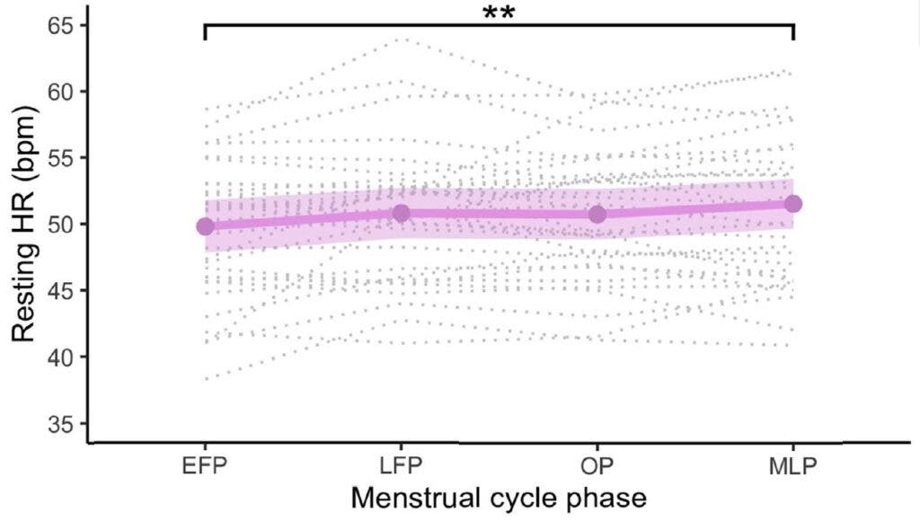 The two asterisks indicate a statistically significant difference between the early follicular (49.6 beats per minute) and mid-luteal (51.3 beats per minute) phases. That’s a difference of 1.7 beats per minute, or 3.4 percent. For context, the typical day-to-day variation in submaximal heart rate is about 6.5 percent. Topranin and her colleagues conclude that this difference is real—and indeed, it does agree with previous findings in non-athletes of increased resting heart rate in the mid-luteal phase—but with a marginal effect size and “limited practical relevance.”