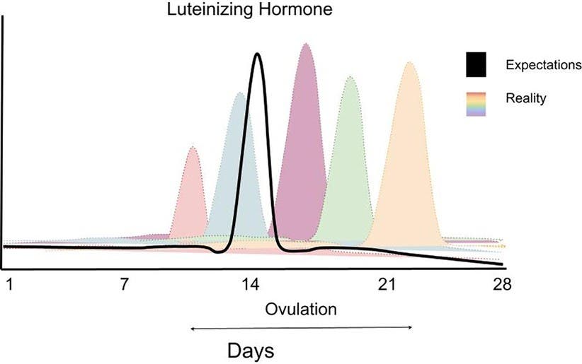 In all cases, the general quality of the individual studies was low. One of the biggest and most widespread limitations was in the methods used to verify cycle phase. Simply knowing when you last menstruated is insufficient to determine your current hormone levels, the authors point out. There’s huge variation in phase length, both among different people and within an individual’s consecutive cycles. Here’s an illustration from the paper showing the contrast between expected fluctuations in luteinizing hormone (in black) and what you actually observe in a group of women (various colors):