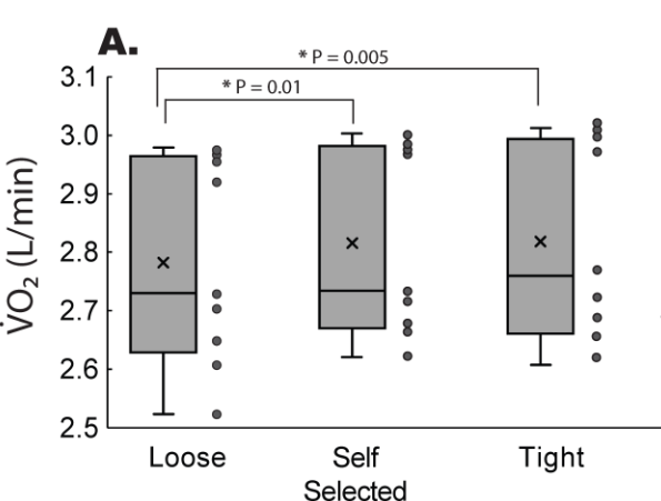 The running tests were performed in three conditions: once with the subjects’ self-selected preferred bra size; once with the bra tightened; and once with it loosened. The pressure of the band in the tight condition was, on average, 16 percent greater than in the loose condition. Here’s what the oxygen consumption (VO2) during submaximal running looked like in those three conditions: