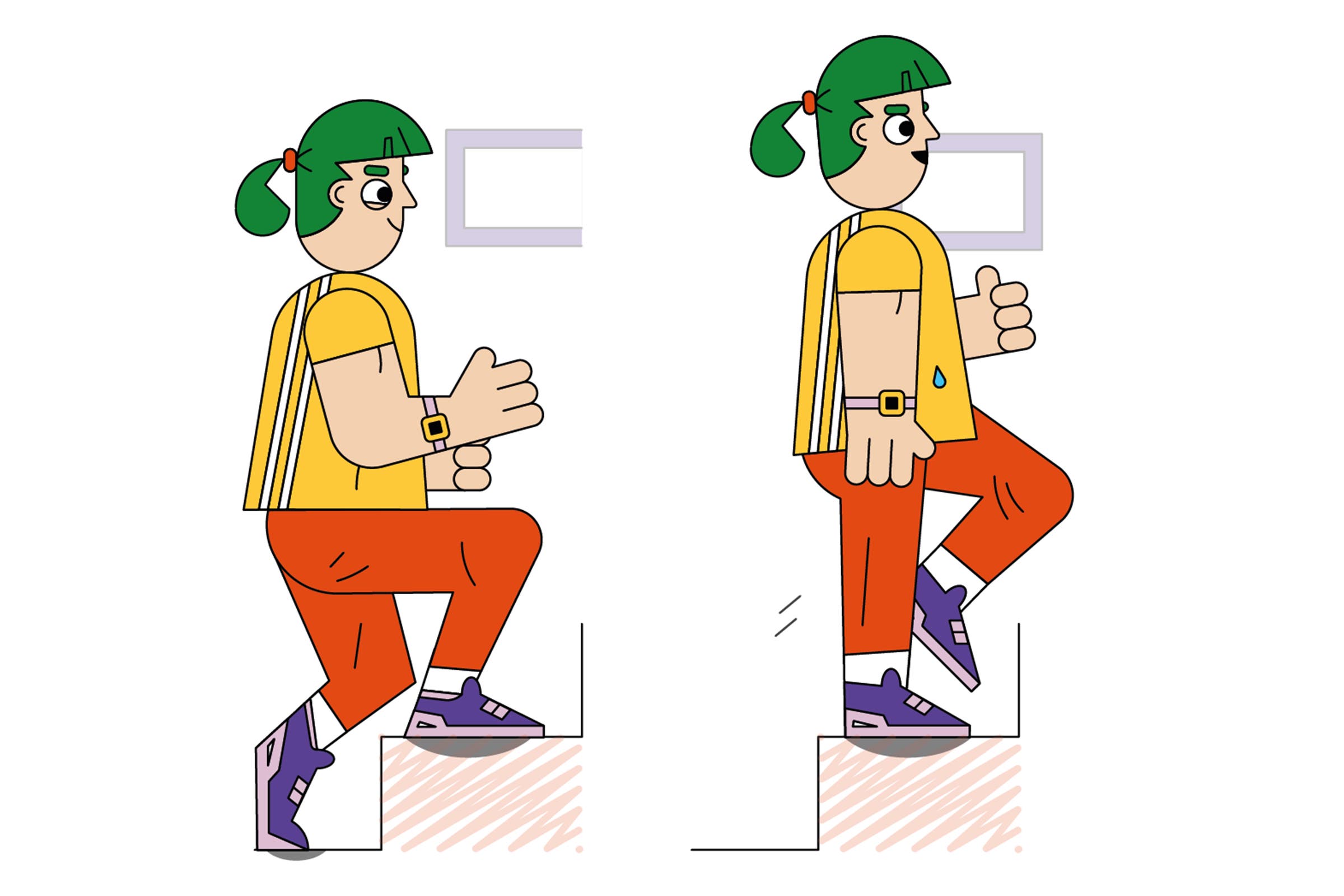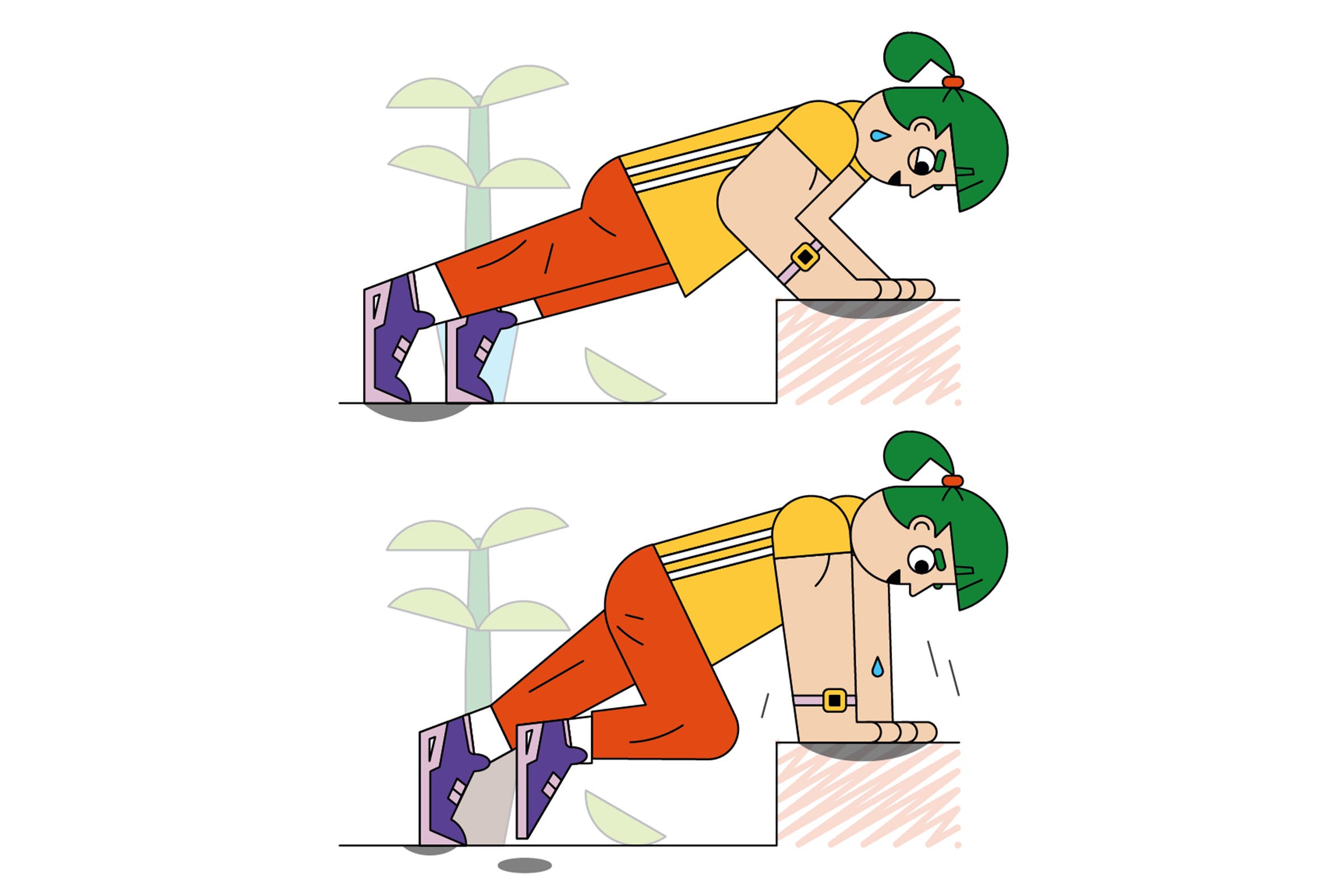 How: Start in a high plank, with your hands on the first step, slightly wider than shoulder distance apart and fingers angled out, and your feet on the ground, hip width apart. Activate your core, glutes, and quads, bend your elbows to lower into a push-up, then press through your palms to return to the start position. At the top, drive your right knee up toward your chest. Repeat with your left knee. That’s one rep. Do 10 to 15 reps.