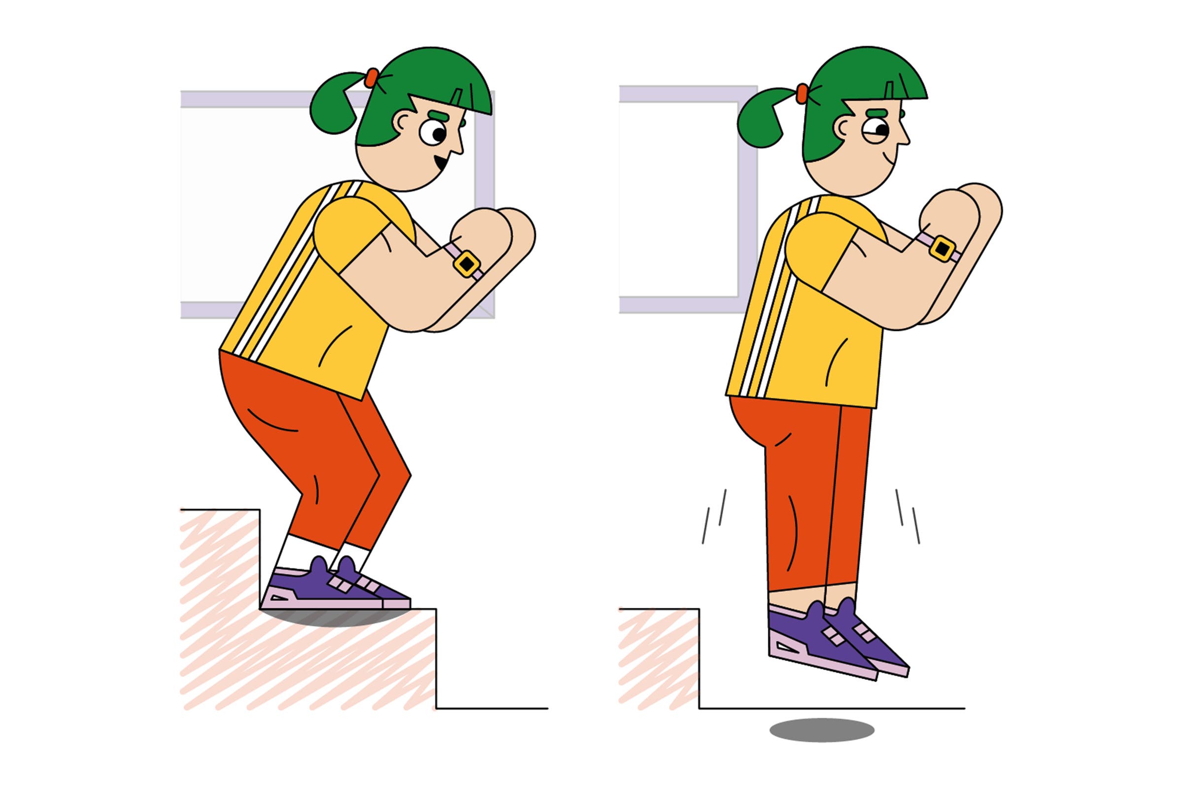 How: Stand tall on the first or second step, facing away from the stairs, with your feet hip width apart. Bend your knees 45 degrees and push your hips back into a quarter squat, then jump up and out, landing lightly on the ground in a quarter squat. Without pausing, jump straight up as high as you can and land lightly again, knees slightly bent. That’s one rep. Do five reps.