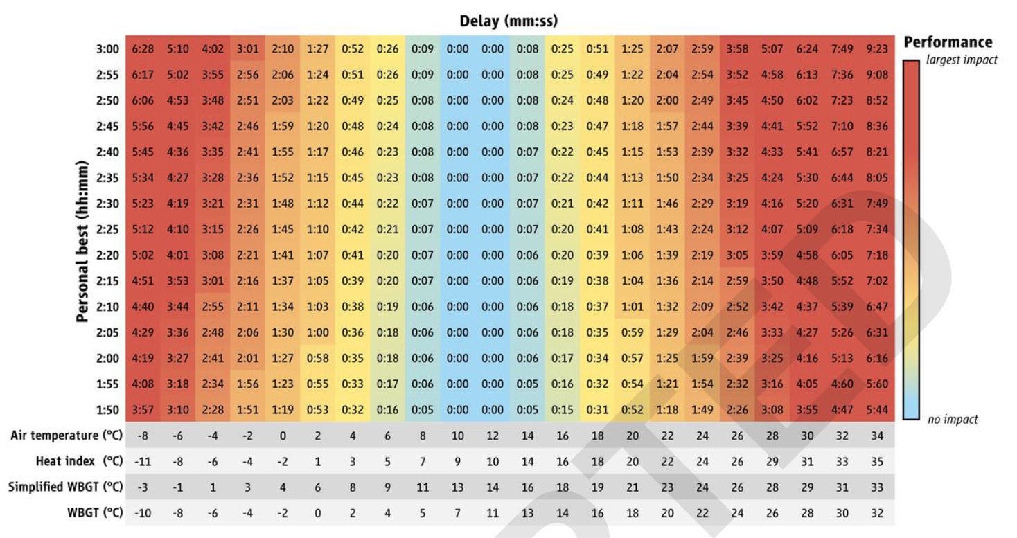 Finally, the practical bit. Here’s a table prepared by the authors that shows, for marathoners at various paces, how much you should expect to slow down based on air temperature, WBGT, or heat index.