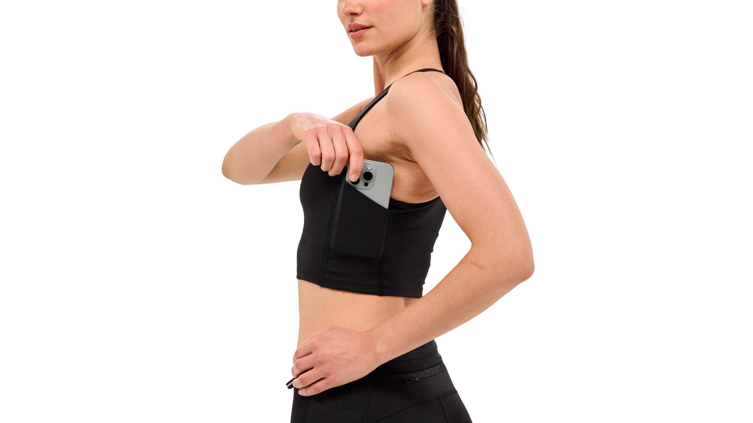 Sports bras with the pocket on the front work fairly well, and the phone is easy to access (especially for those with tight shoulders, like me). Bras that carry phones in the side pockets work, too. But I’ve found that a pocket on the upper middle back of a sports bra secures a phone better, balanced close to the center of my body, with less bounce, than carrying it virtually any other place on the body—it’s a true gamechanger.