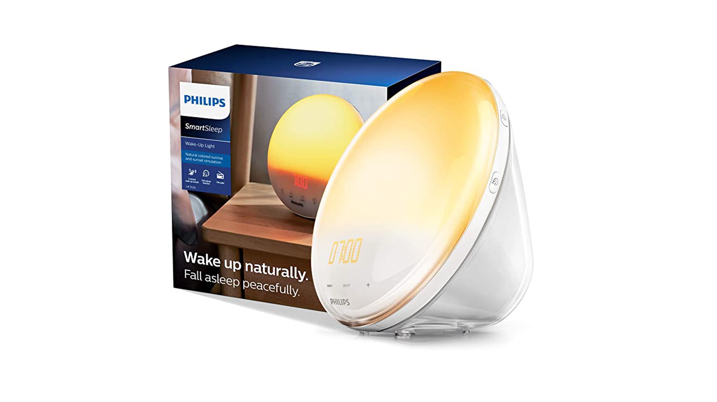 Rather than jar you out of bed with bells or chimes, this combination alarm clock and bedside lamp gradually brightens starting 30 minutes before you want to wake up. The process culminates with a bright yellow glow and the sound of birds, ocean waves, or the radio.