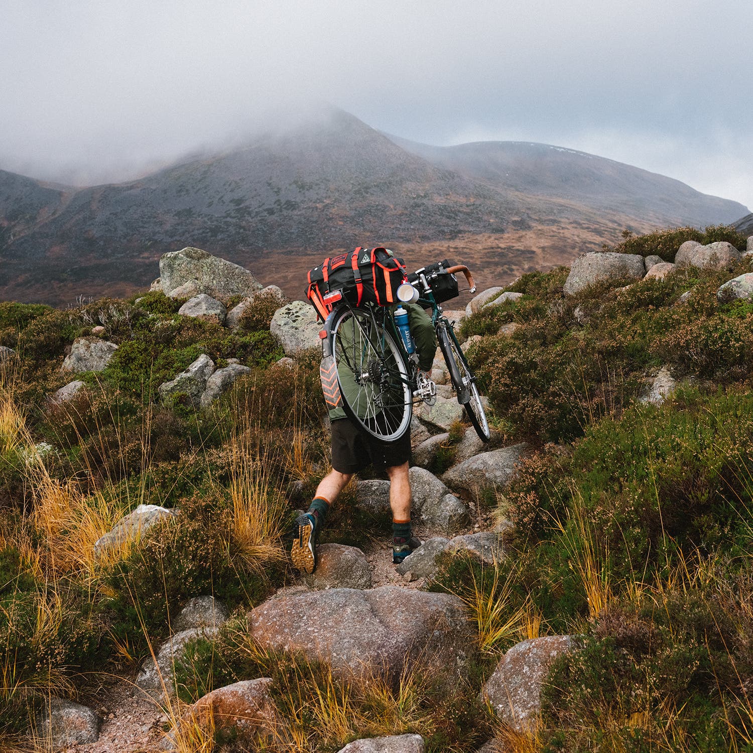 That would prove to be an optimistic assessment. After we departed the bothy, the path grew increasingly rocky, and soon we encountered the first of three enormous boulder fields, each stretching the length of several football pitches. The rocks were huge, jagged, and uneven. Repeatedly as I scrambled across them, looking for traces of footsteps that centuries of travelers had burnished into the rock, I nearly lost my balance, owing to the saddlebag-bearing bike slung onto my shoulder; my only consolation was that I didn’t have Ben Brown’s overladen steed. “Taking the bike places it normally does not go,” another RSF mantra I’d heard, was fine enough in theory, but one could equally have carried an ironing board, an upright bass, or a potted plant for all the good it was doing.