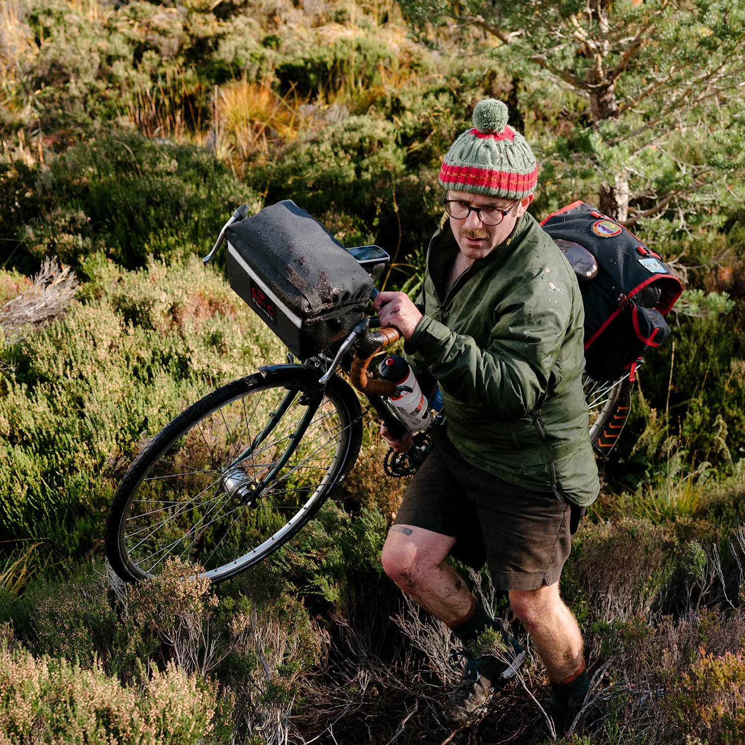 We laughed him off, but the comment proved sage. As the sun set, we’d not yet reached the Rothiemurchus Forest, the point at which we could ride our bikes on a proper path. Instead, we were trudging through a bog-filled minefield, using our headlamps to try and pick out a safe place to walk; I would avoid twisting one ankle only to plunge my other foot deep into freezing mud. I’d pushed and carried my bike more than 20 miles, up nearly 3,000 feet of elevation, and was admittedly at the breaking point. We finally made it to the hostel in Aviemore at 8:45, to the chagrin of the sole kitchen worker cleaning up for the night. Over fish and chips, the bulk of us decided we’d return to Braemar via a route with plenty of rough stuff but more conducive to actual cycling. Only Lewis and Ben Read, the photographer, opted for the more arduous return. The next day, after a ride that Brown described as “unrelentingly ace,” we stopped for a celebratory pint at a café called, appropriately, the Bothy. My phone chimed with a text from Ben Read, accompanied by a clip of Lewis riding his bike, his tire hopelessly shredded, held to the rim by bungee cords. Since much of their ride would be walked, it didn’t much matter. “That’s so Lewis!” chuckled Stu.