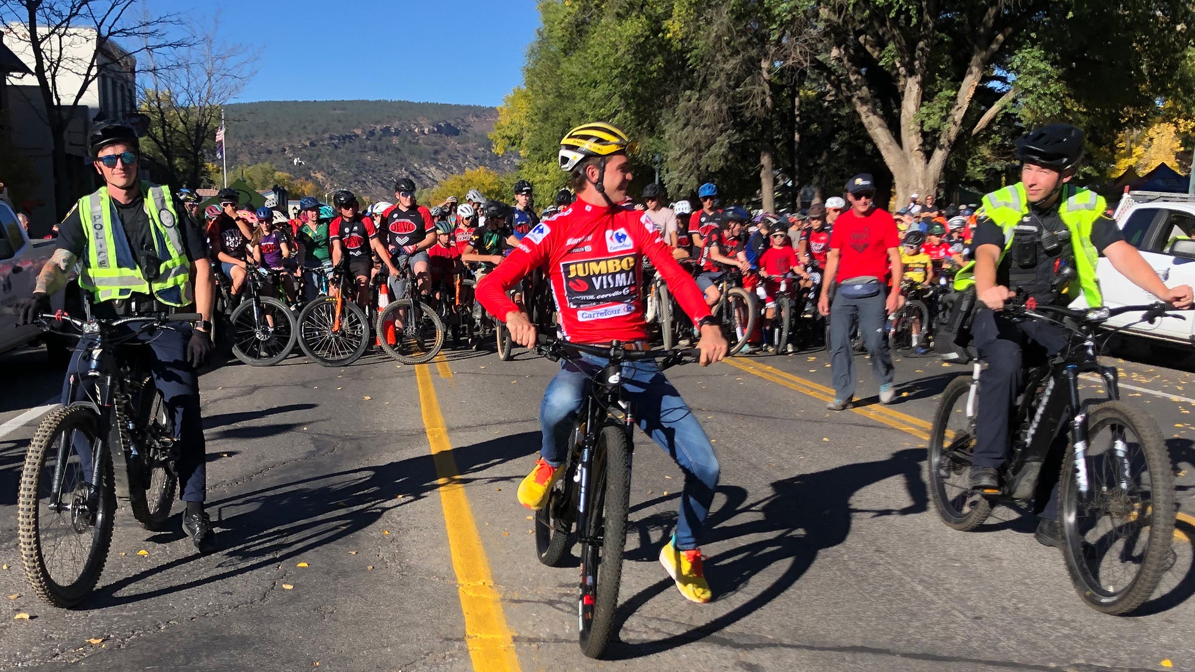 Longtime racing announcer Dave Towle took the stage to warm up the crowd at 3:30 P.M. “The eagle of Durango has landed!” Towle screamed. Mayor Youssef went next. “It’s very likely that the next world champion is here in the audience today,” she said. I stood near the stage and looked behind me—I saw row after row of children screaming, many of them wearing the team colors of Jumbo-Visma, Kuss’s WorldTour squad.