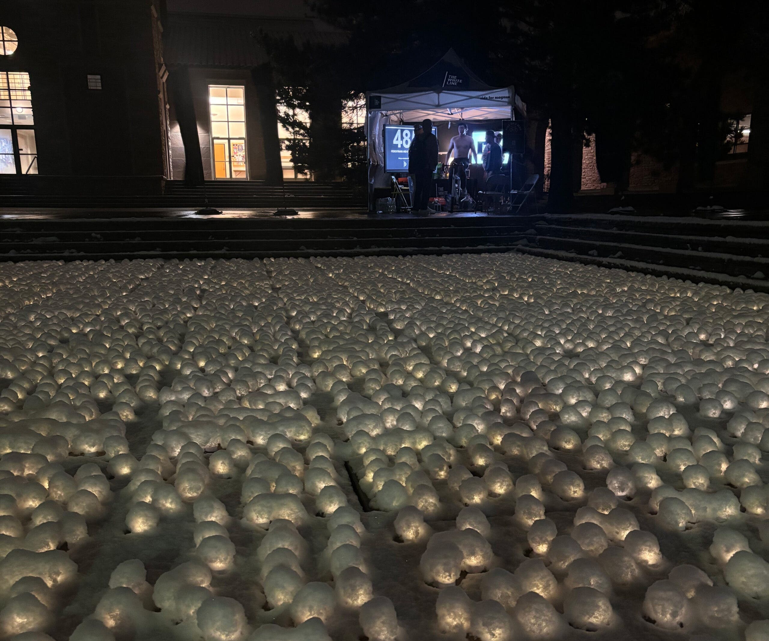 The music dies down and Coloin and his buddies high-five. A few yards away from the tent, Michael White snaps a wide-angle photograph of the scene. In front of the tent stand 8,423 electronic candles that flicker at night. The number has become a rallying point for the nonprofit.