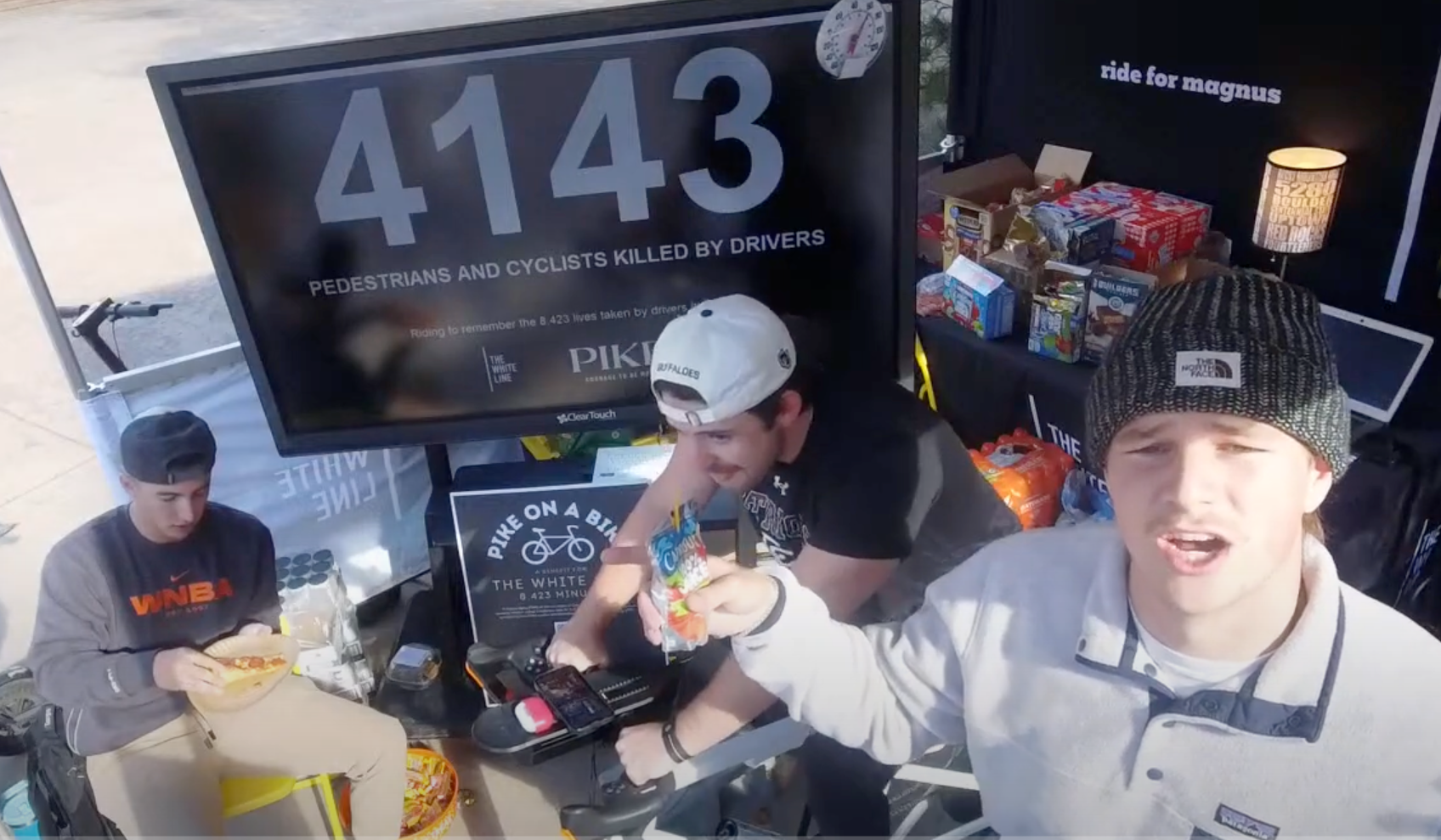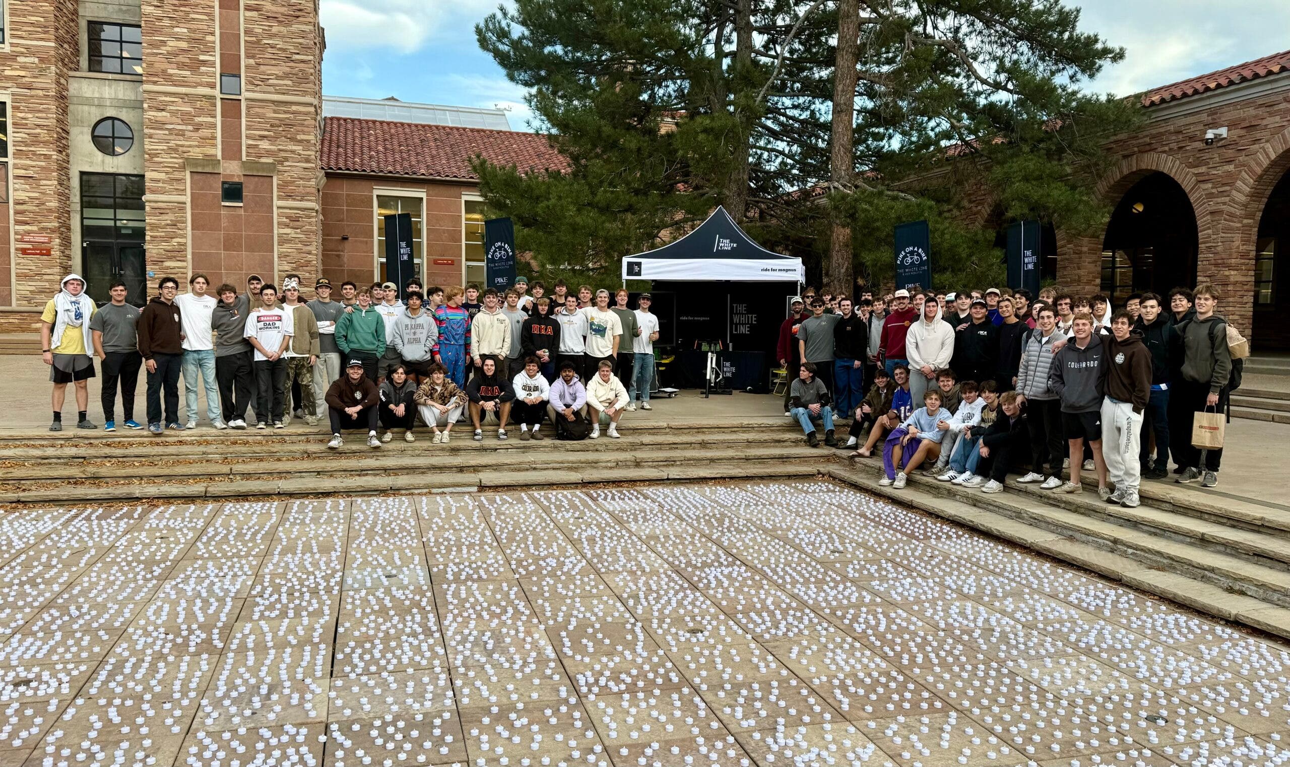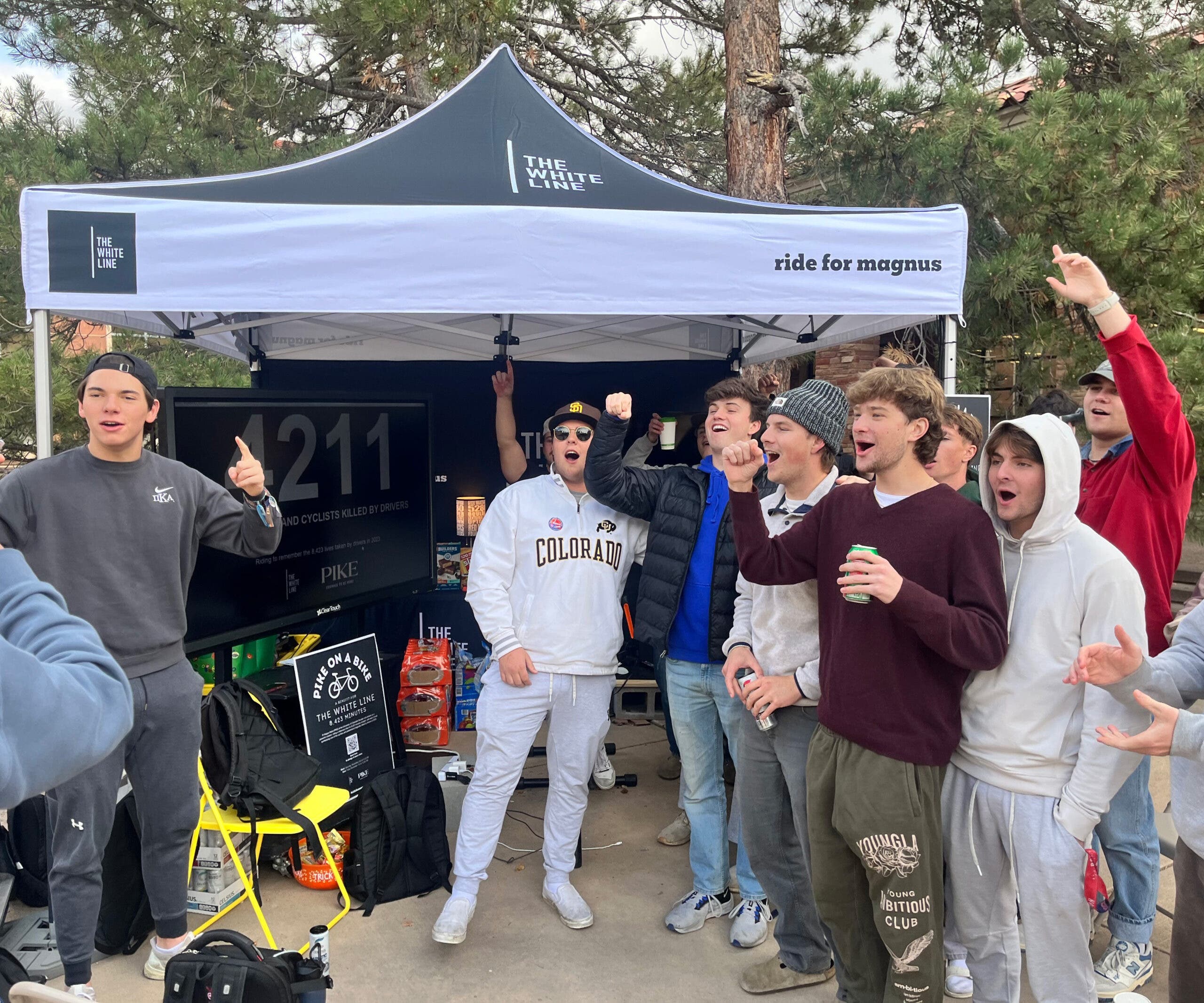 They are indeed halfway. The cyclist, Thomas Coloian, and many of the onlookers are members of the university’s Pi Kappa Alpha fraternity, and they have just hit the midway point of a highly unorthodox charity stunt. The brothers are riding a stationary bicycle for 8,423 consecutive minutes—that’s just shy of six straight days—to raise $100,000 for a local non-profit called The White Line. The organization is named after Magnus White, a local cyclist who was struck and killed by a motorist in 2023. The number of minutes symbolizes every cyclist or pedestrian killed by a driver in the United States in 2022.