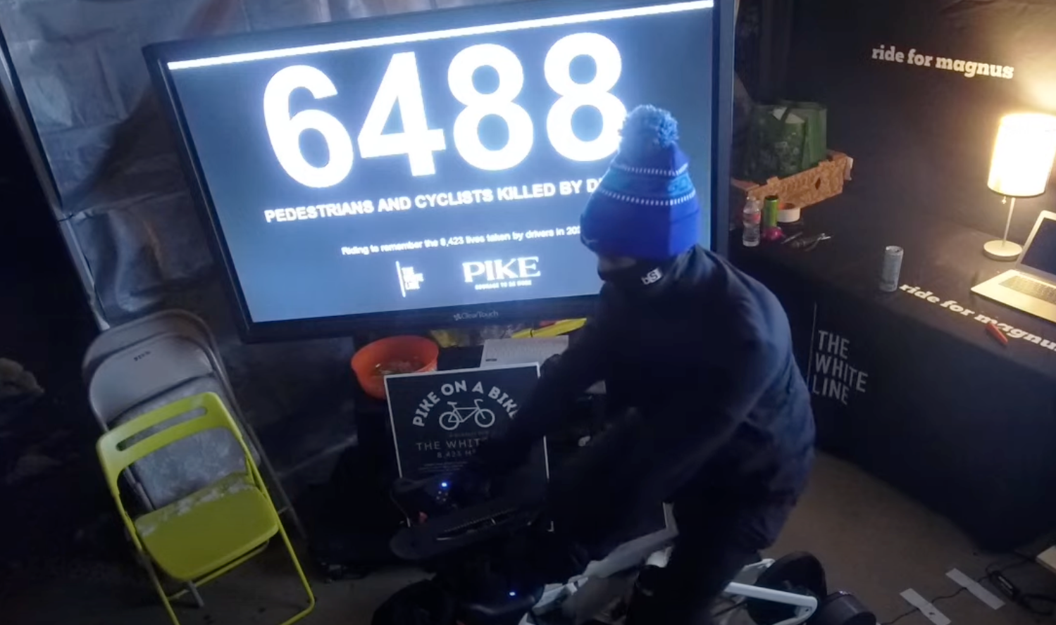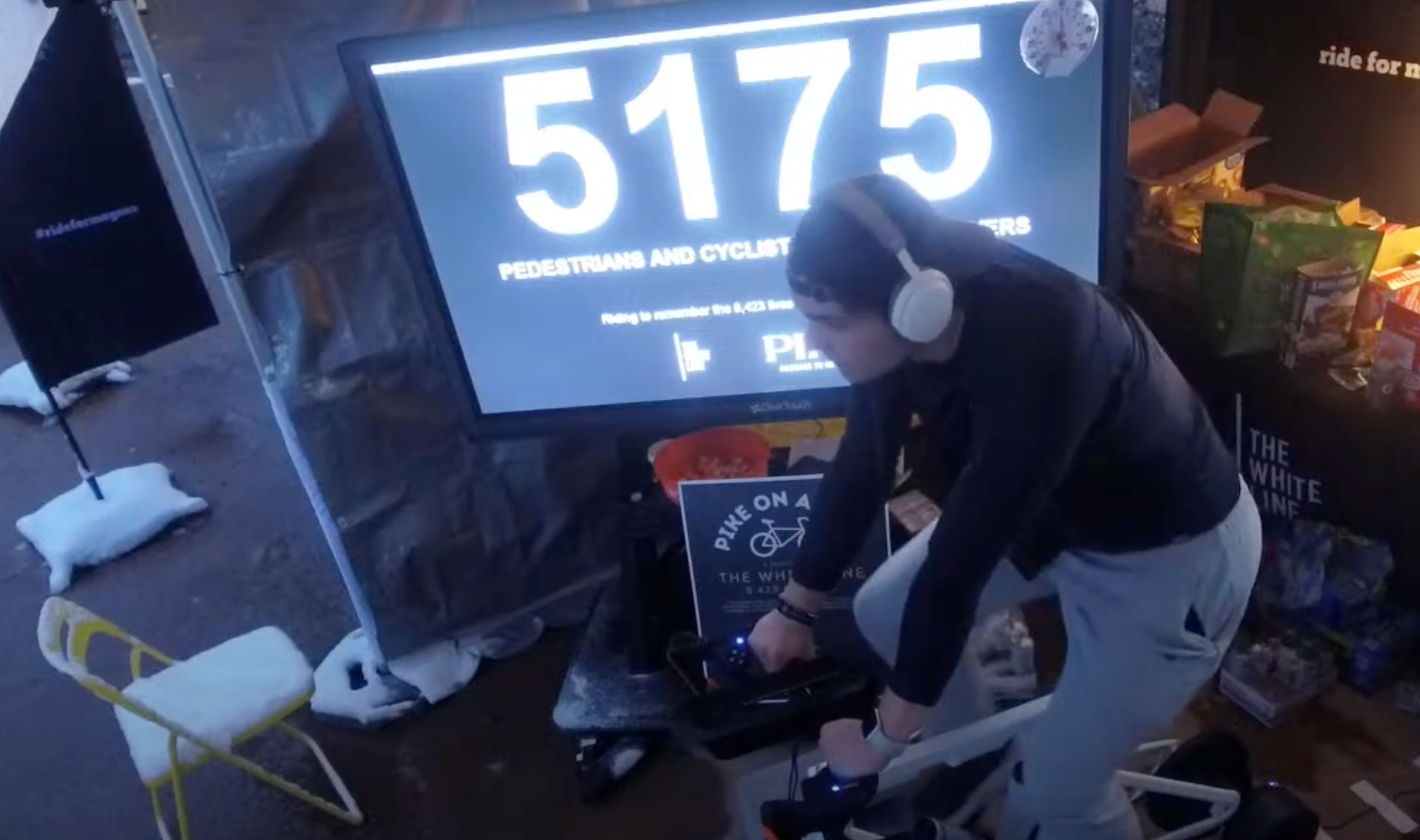 The charity ride is being beamed live across YouTube, and a TV screen adjacent to the stationary bicycle provides a minute-by-minute update of the donations coming in via the livestream.