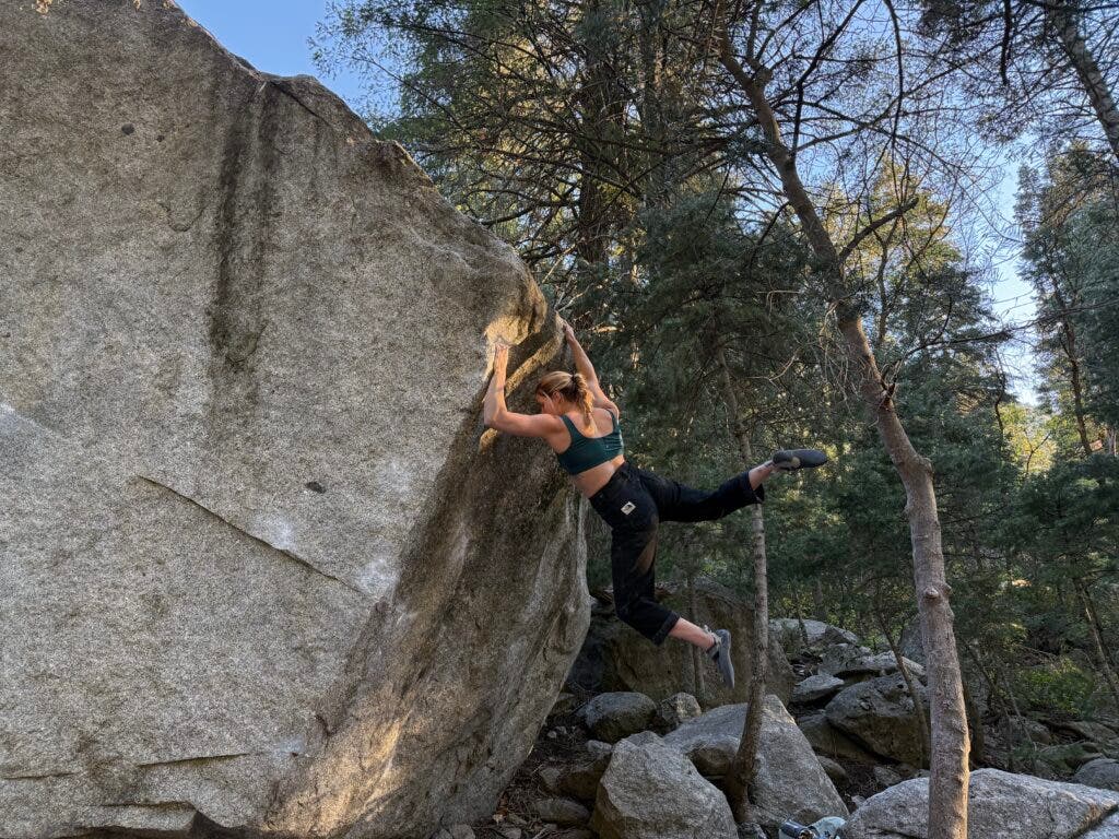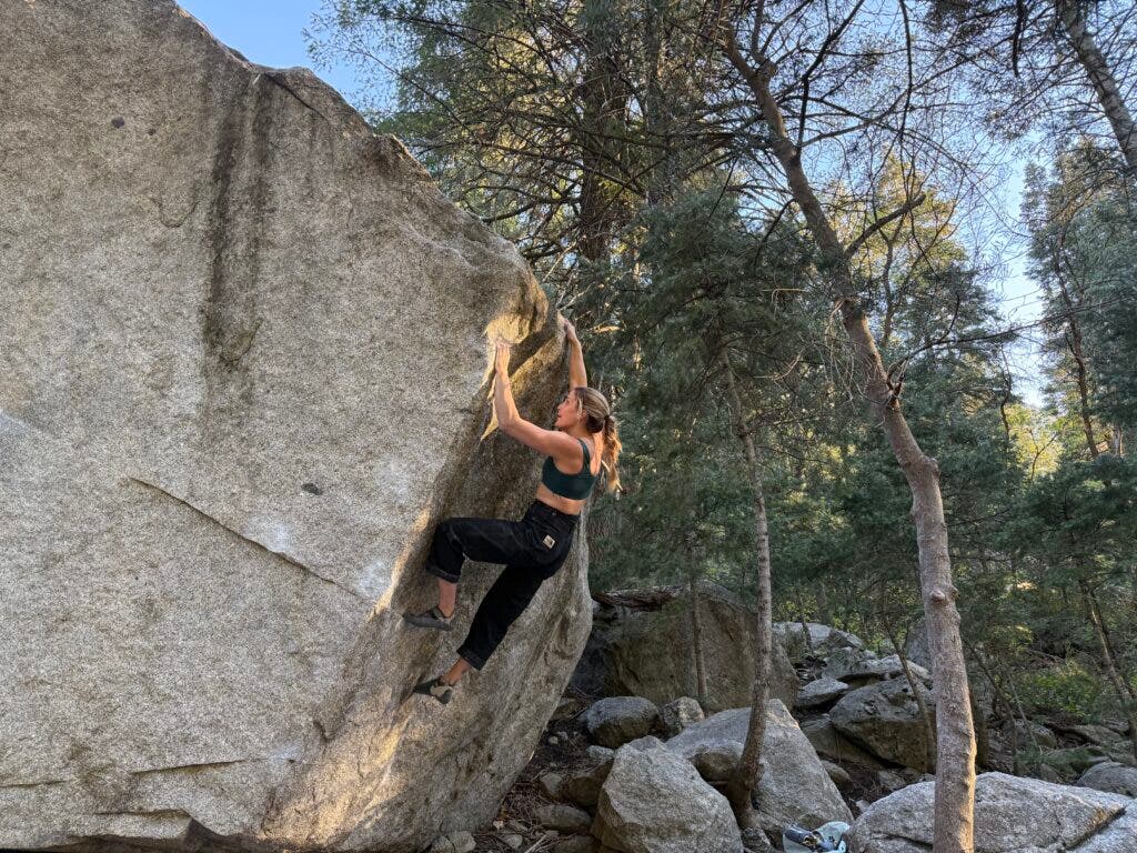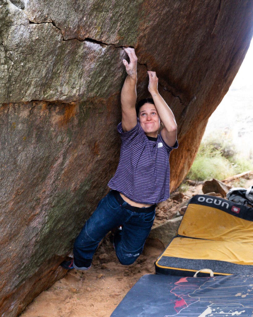 For example, with a pair of pants I made, I worked on them for seven or eight months. I had to make all these different iterations of them and they weren’t working. I had to try something new, switch this and that, take some measurements out of the waist, add space in the hips. I think that’s similar to climbing, too. When you’re trying to figure out the beta for a boulder, it’s just trial and error. You try one thing, it doesn’t work. You try something else. And then you slowly figure out what the best way is.