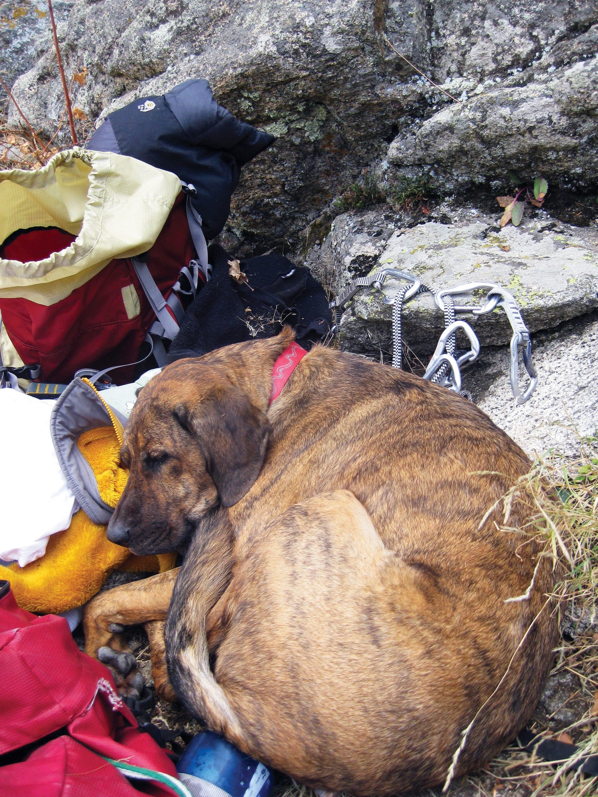 Clyde liked to dig dirt nests at the cliff, which I’d fill in and cover with duff. He’d often use rocks as pillows or even find horizontal fissures in cliff-base slabs to lie in. If your backpack looked like the softest thing around, Clyde would lie on that, too. I mostly climb at obscure cliffs, so I could leave him unleashed, but after the sandwich incident in Eldo, if I was visiting a busy area I’d either leave Clyde at home or tie him up.