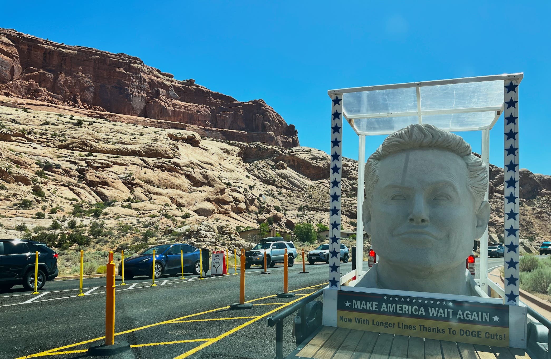 The sculpture was accompanied by a sign emblazoned with “MAKE AMERICA WAIT AGAIN” and below that “Now With Longer Lines Thanks To DOGE Cuts!”