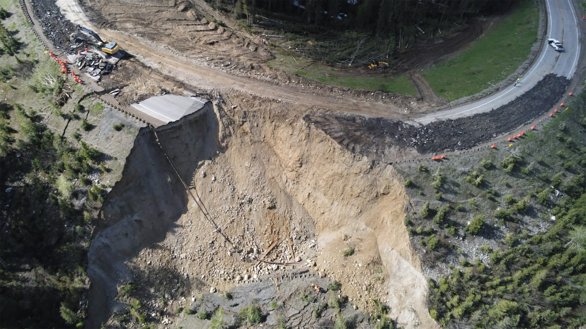 The resulting crack was up to eight inches deep in places, and spanned both lanes of travel at a hairpin turn. The road closed for several hours as crews worked to inspect and patch the rift. The road reopened Thursday night, but relief was only temporary, as shortly after 4:00 A.M. Friday, mudslides a few miles east sent crews scrambling to repair the road, closing the pass yet again. Later that evening, the rift back at mile marker 12.8 expanded dramatically—elevating into a full-blown landslide—with a large portion of the alpine highway plummeting into the ravine below.