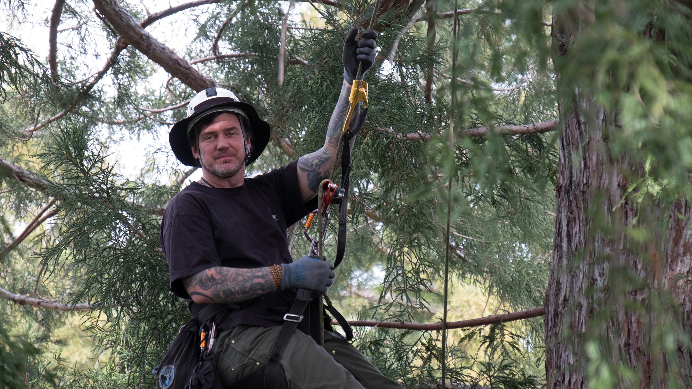 According to SFGate, a sizable portion of ninja tree climbers are professional tree maintenance workers—called arborists—just like Kovar. They don’t actually ascend the tree’s trunk and limbs, but instead climb a rope that they’ve shot up into the canopy using a crossbow. Arborists ascend the line using the same jumars that big-wall rock climbers and alpinists often use in steep terrain. They wear a specialized harness, called a saddle, that offers protection in case of a fall, and also gives them a place to sit when they are enjoying the canopy while suspended in midair by a rope.