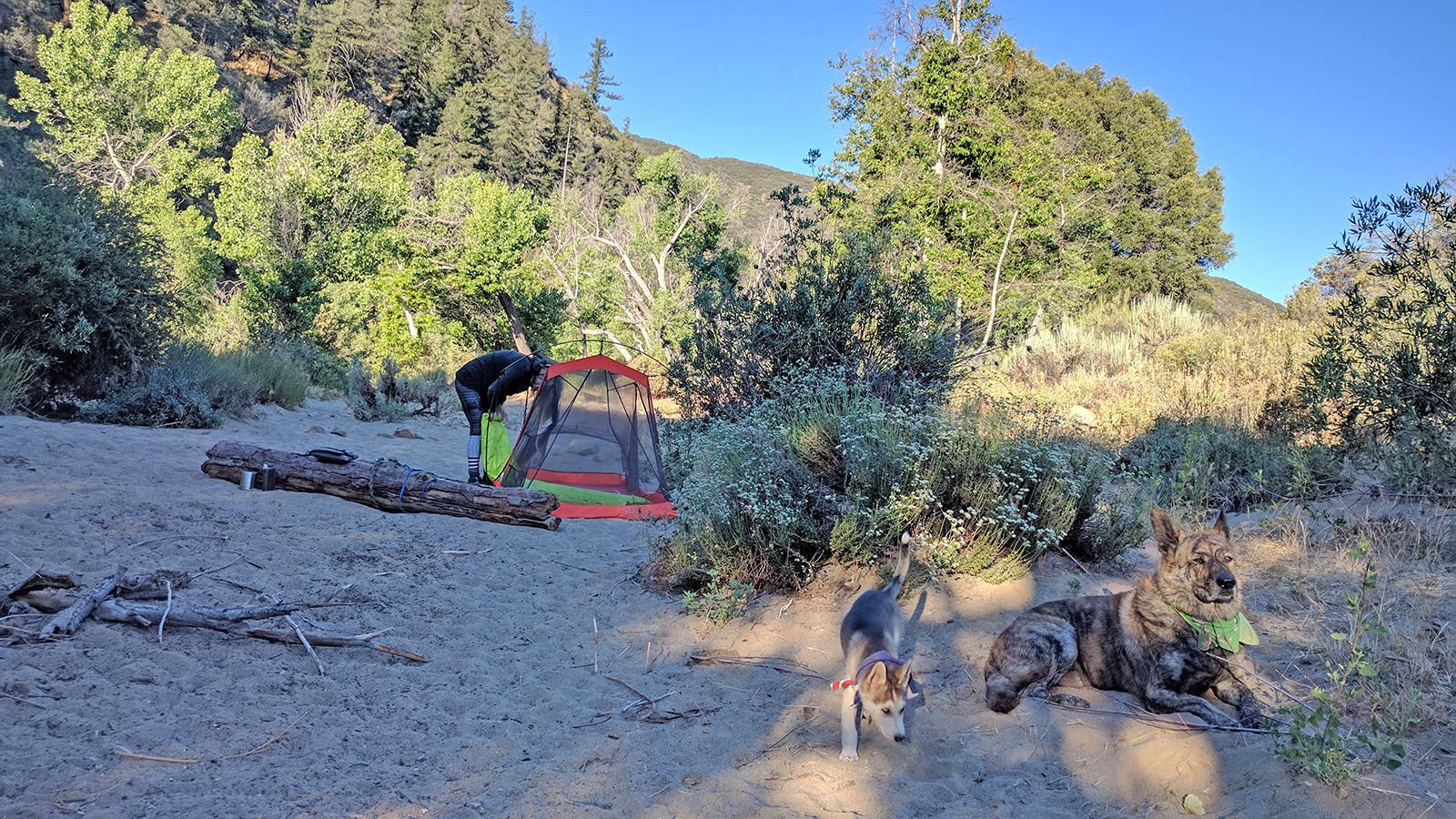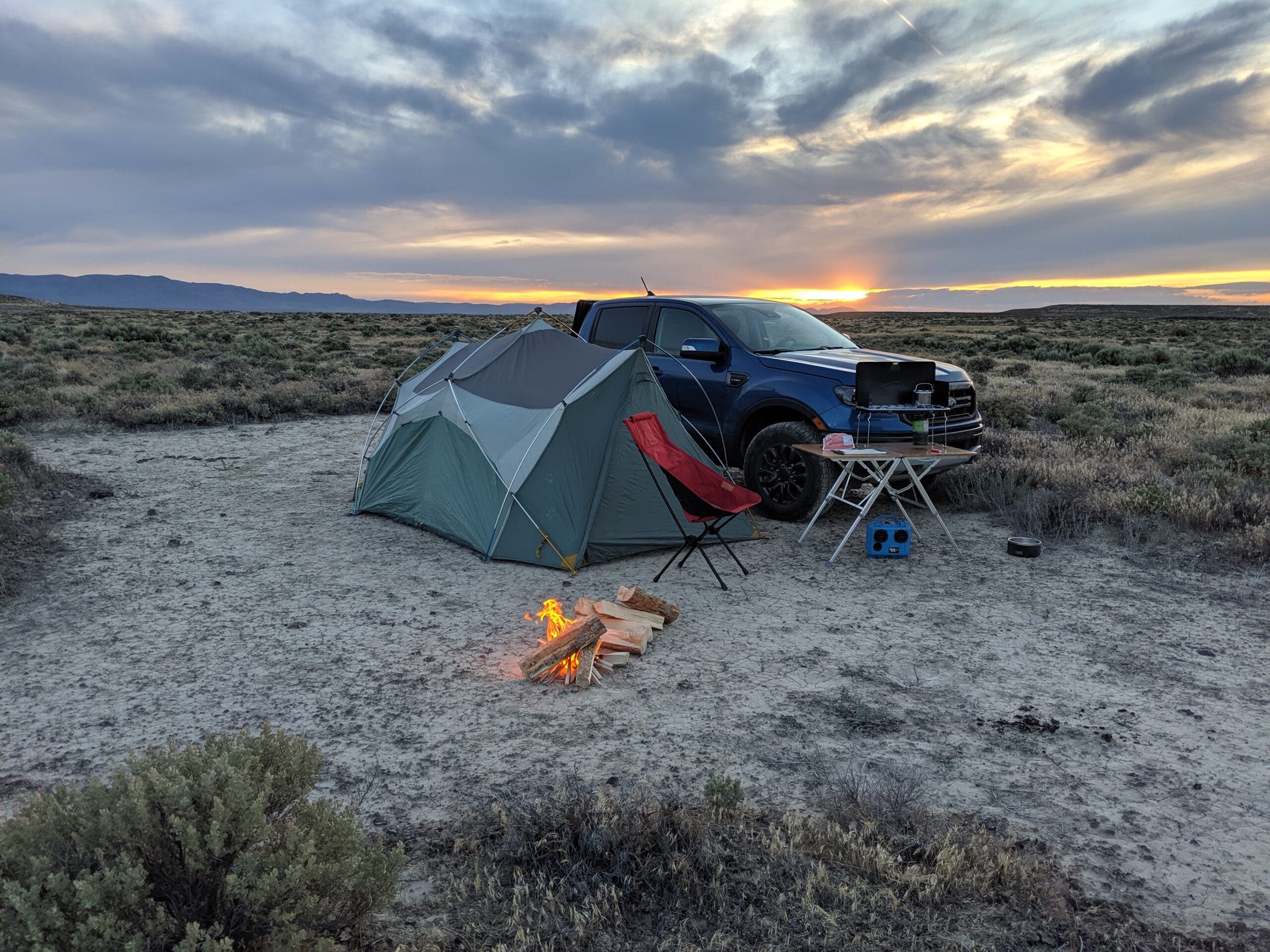 Shelter: As night begins to fall and temperatures begin to drop, winds will increase. These gusts can destroy high-profile tents and shade structures, and even more commonly make those things noisy and nerve wracking to sleep in. I like to bring a low-profile backpacking tent instead. Once you’ve divined the evening wind direction, pitch that behind a vehicle, boulder, or other windbreak.