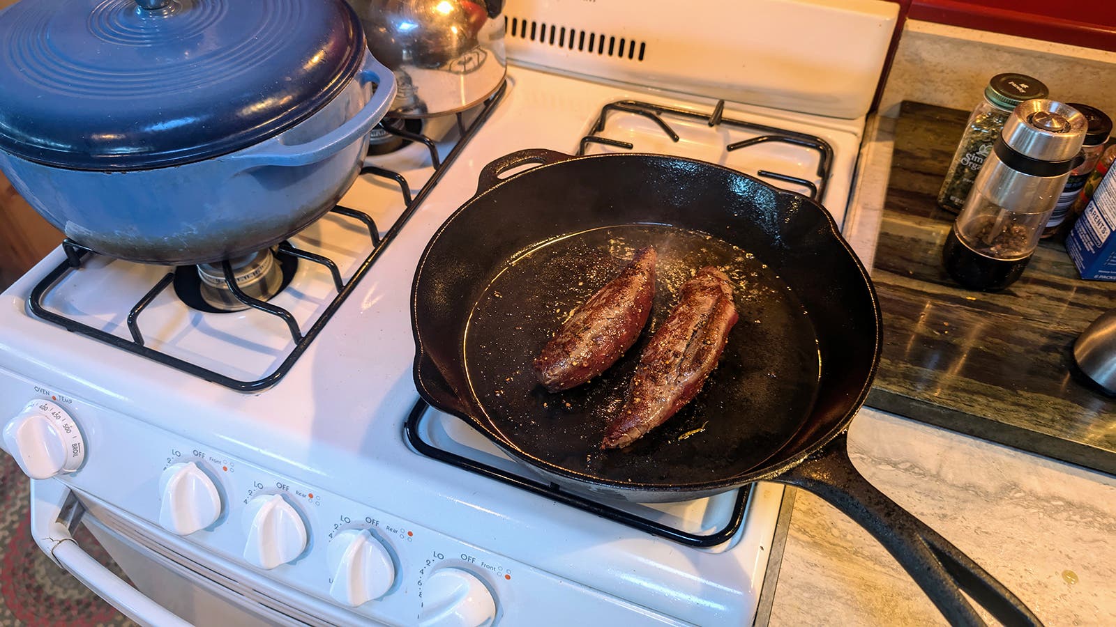 Next, I like to sear the whole tenderloins at the highest heat possible, creating a crusty brown exterior through what’s known as the Maillard Reaction. I cooked the ones you see here at our family’s cabin in the Blackfeet Nation (located within Montana) on a windy night, and the best tool available to me was the very basic, nineties-era gas stove that maybe puts out 10,000 BTU. So, I added a tablespoon or so of that good olive oil (which has a much higher smoke point than the fake stuff) to a cast iron pan, and set it on the hottest burner, turned up to the highest level for a good five minutes before adding the meat. I then seared it each side for about one minute to produce a brown crust all over the exterior of the tenderloins, while leaving the interior completely raw.