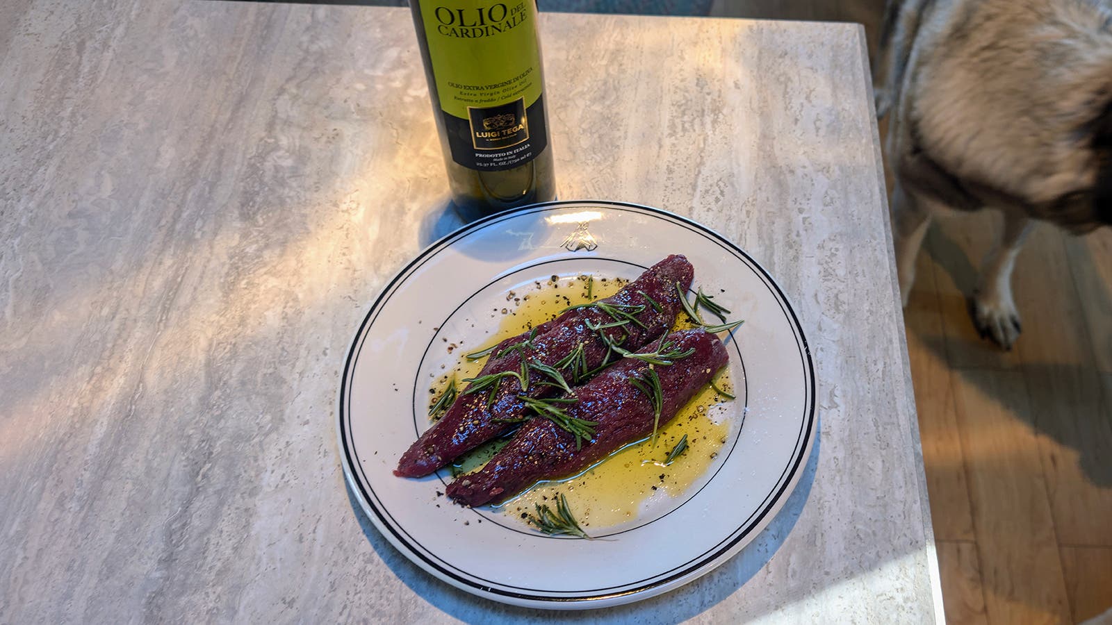 Unlike domestic livestock, which are fed artificial diets, wild game animals will have virtually no fat content within muscle groups. So, when I’m grilling it, I like to first rub olive oil all over the cut along with the seasoning. This seals in moisture, and adds a little fat to the cooking process. Make sure you’re using actual high-quality olive oil (a New Yorker investigation found most stuff on store shelves is fake). In my kitchen, I only use Luigi Tega’s Olio del Cardinale. I’ve visited the Tega family to see their farm and process in Umbria, and because my friend David Dellanave imports the stuff to this country, I know it’s fresh.