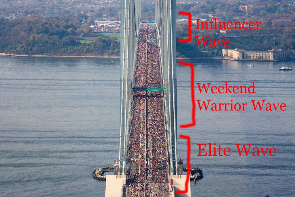 Lucky for you, I have the answer, and I’m here to present my semi-serious solution to endurance sports’ content-creator conundrum. Similar to how race organizers create separate waves for elite athletes, they should also make a distinct influencer wave, and place it at the rear of the field. I’ve used my rudimentary Photoshop skills to create a basic diagram below.