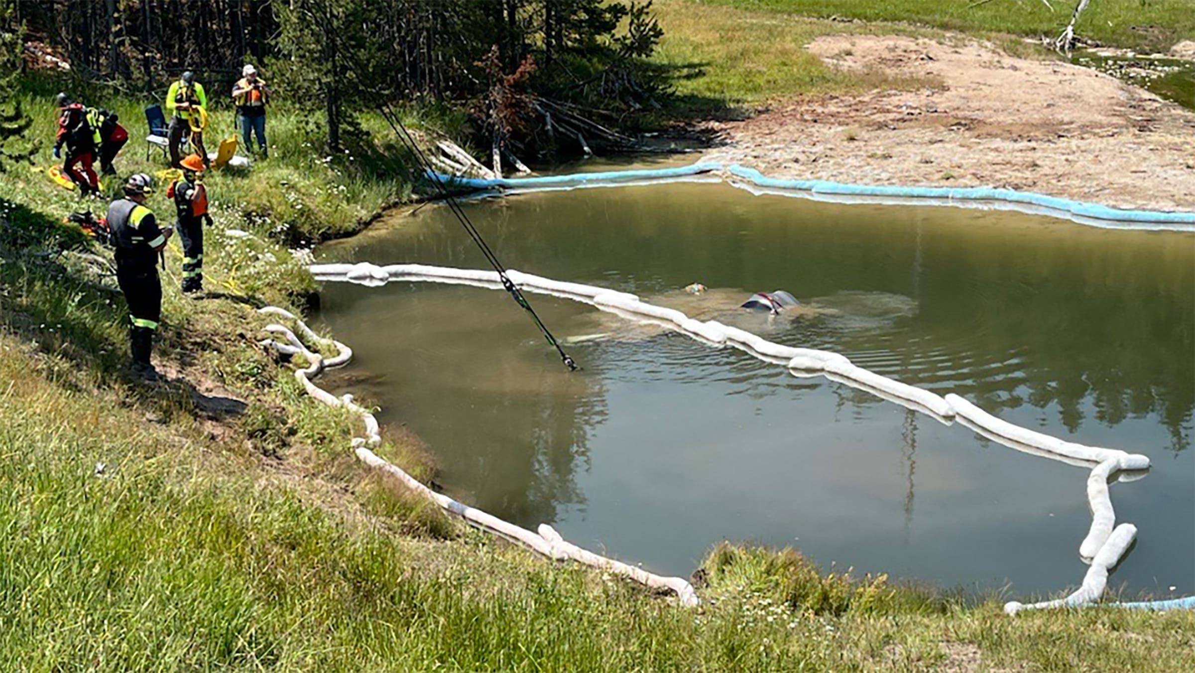 The vehicle spent a day at the bottom of the thermal feature, which is located near the Roaring Mountain attraction, just south of Mammoth Hot Springs. Then, on Friday morning, work crews closed the road so that recovery specialists and trained divers could hoist it out of the water with a crane. Photos showed the drenched SUV being towed up the side of a steep grassy hillside above the hot pond. Officials said they are investigating the incident.