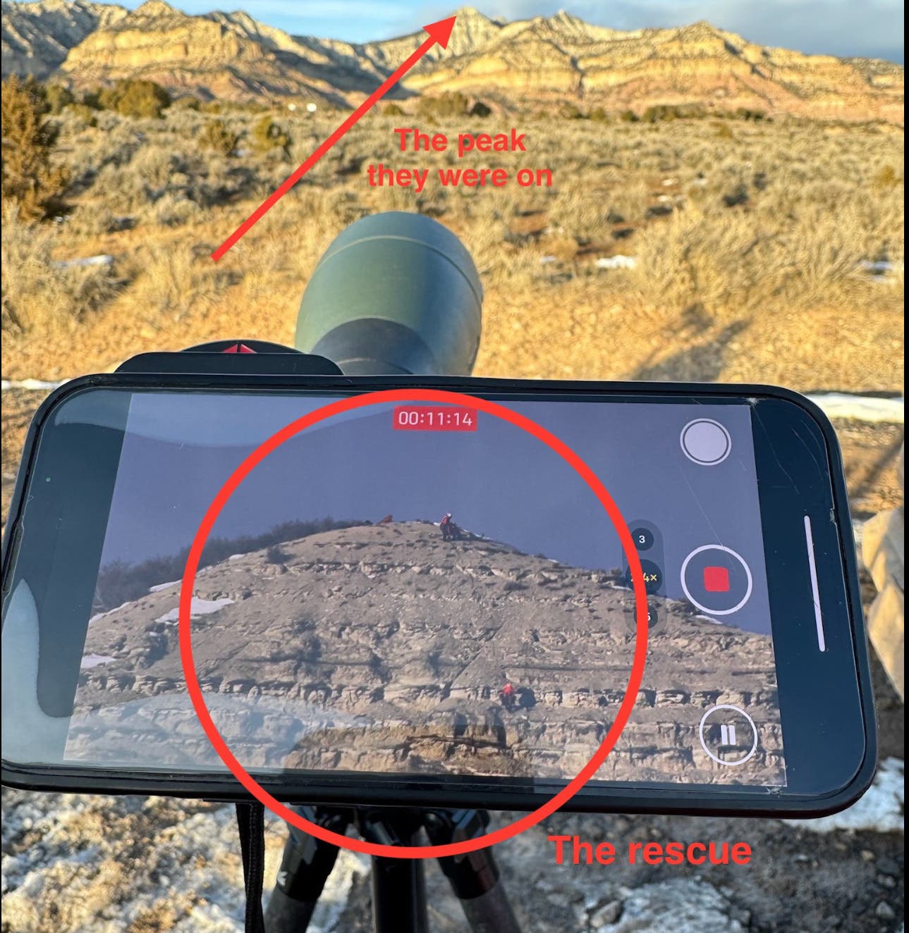 It was nearly 4 P.M. when Bean and Ingalls finally located the bluffs above Tiny. Several miles away, SAR members set up a spotting lens to watch the operation unfold. After fixing anchors, Bean descended the cliff, found Tiny, attached her to a specialty dog harness, and lifted her to safety.