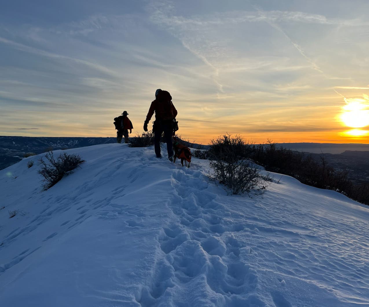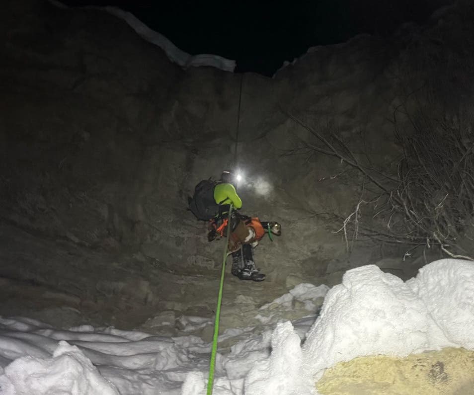 Fifteen SAR members met at a trailhead near Collbran that morning. Due to the tricky terrain, the group split into two groups to see if they could find the best route to the top of the cliff. The hike in took far longer than they anticipated, as the teams had to trudge through knee-deep snow drifts and navigate tight gullies and washes.