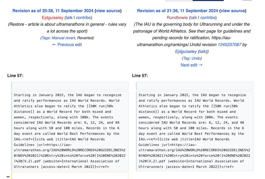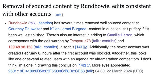 Rundbowie was prolific on Wikipedia, and made frequent tweaks and updates to other biographies. The account had removed language from the pages of Jornet and Dauwalter—specifically deleting the text “widely regarded as one of the greatest ultramarathon runners of all time.” Rundbowie had then attempted to add this exact language to Herron’s page. Both attempts were eventually denied by Wikipedians.