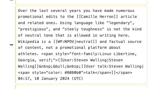 Moderators had warned Temporun73 in January about its updates to Herron’s page. A moderator emailed the account saying: “Using language like ‘legendary,’ ‘prestigious,’ and ‘steely toughness’ is not the kind of neutral tone that is allowed in writing here. Wikipedia is a factual source of content, not a promotional platform for athletes.”
