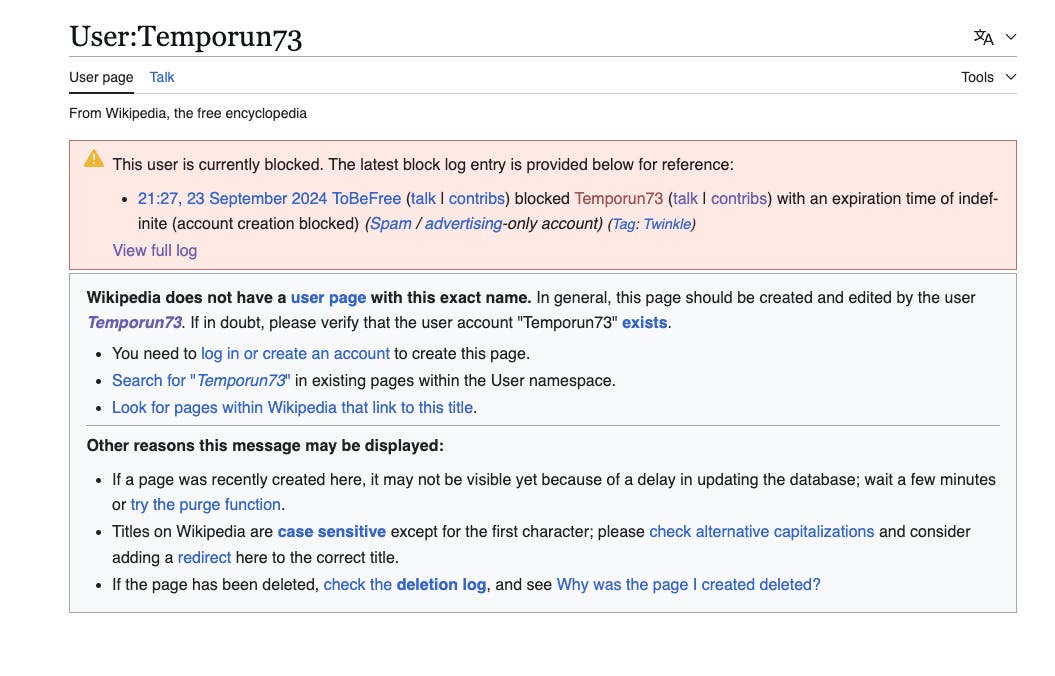 But Dickinson wasn’t done with his detective work. He saw that in March, Wikipedia had warned Rundbowie on its public Incident Report page. The reason? Rundbowie’s activity was nearly identical to that of a previous commenter that had been suspended for making repeated edits to Herron’s Wikipedia biography. That account was named Temporun73. Moderators had shut down Temporun73 on February 8, which was the same day that the Rundbowie account was created.
