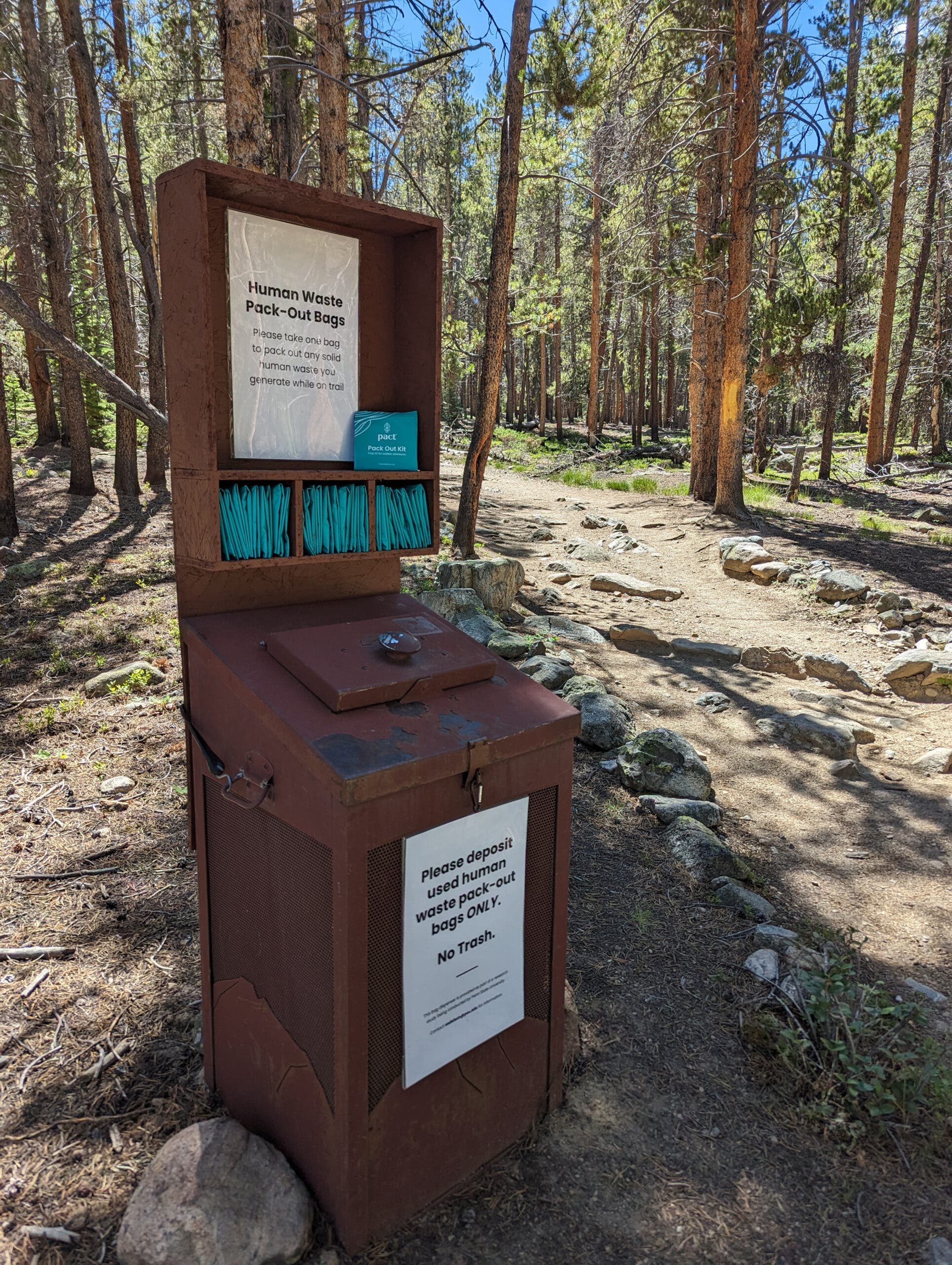 PACT’s solution was to build a kiosk at the Mount Elbert trailhead stocked with complimentary WAG bags, and a sanitary receptacle for disposing of them. A researcher from Penn State tracked results for 20 days and surveyed hikers on their general attitude toward WAG bags.