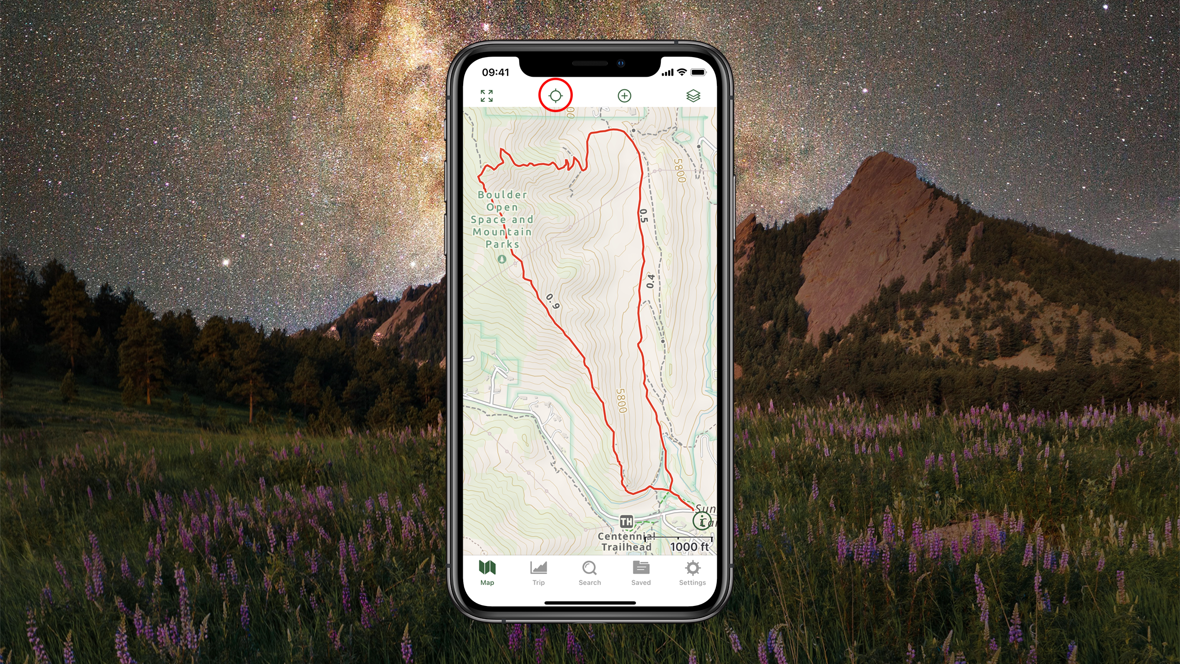 Pro tip: You can quickly see how far away you are from the trail or the trailhead. Simply tap your desired destination on the map, and a drawer will pop up on the bottom of the screen showing the distance to it.