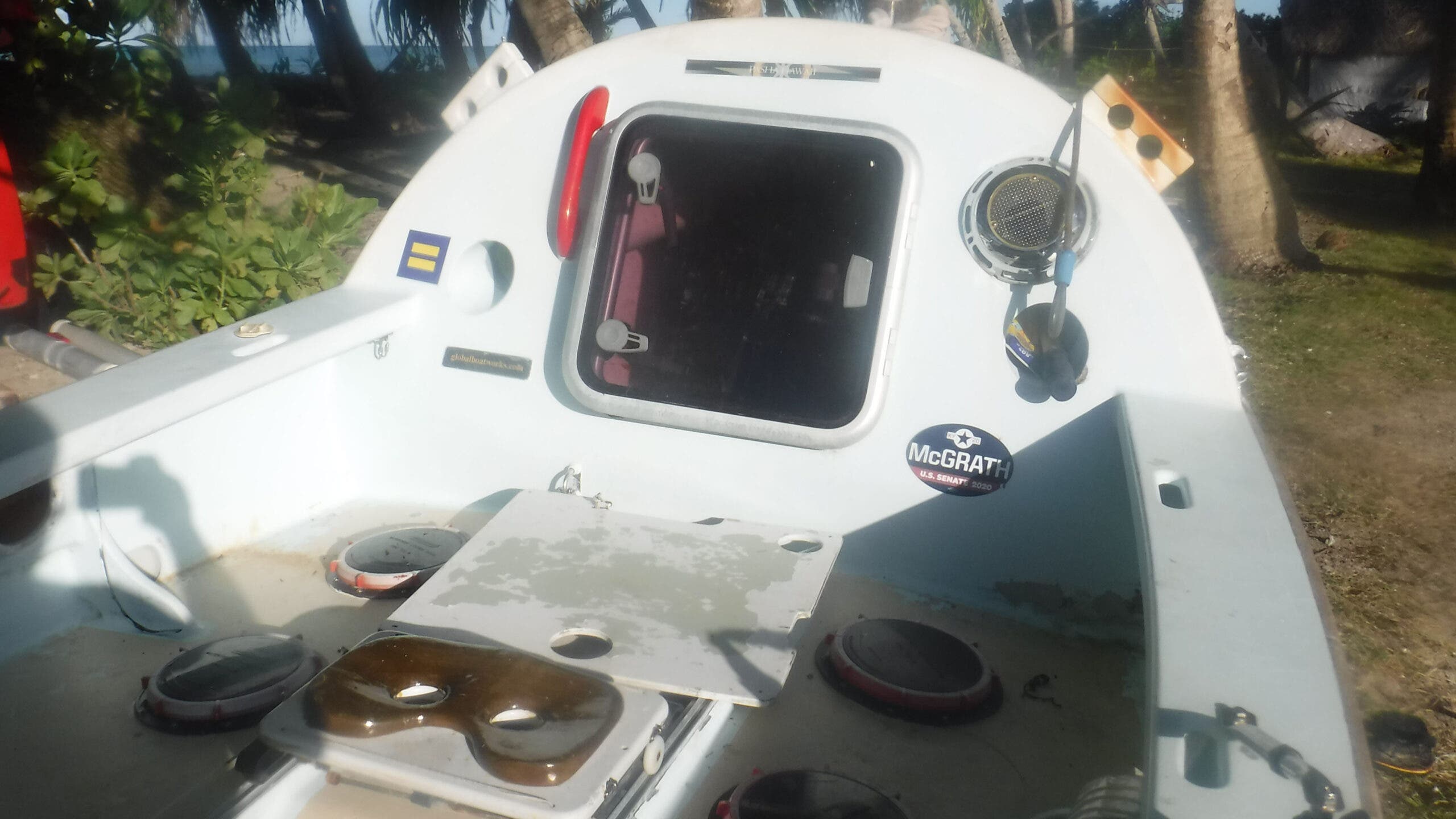 For being lost at sea for over a year and drifting nearly 4,000 miles, the Row of Life appeared to be in remarkably good shape, save for some damaged solar panels, rust stains on the forward cabin, and a crack on the starboard hull, which Chutaro told me likely happened when the boat hit the reef just before washing ashore.