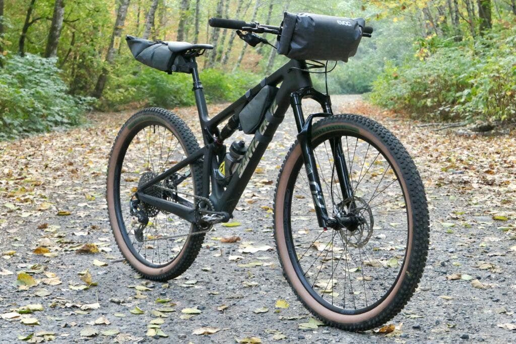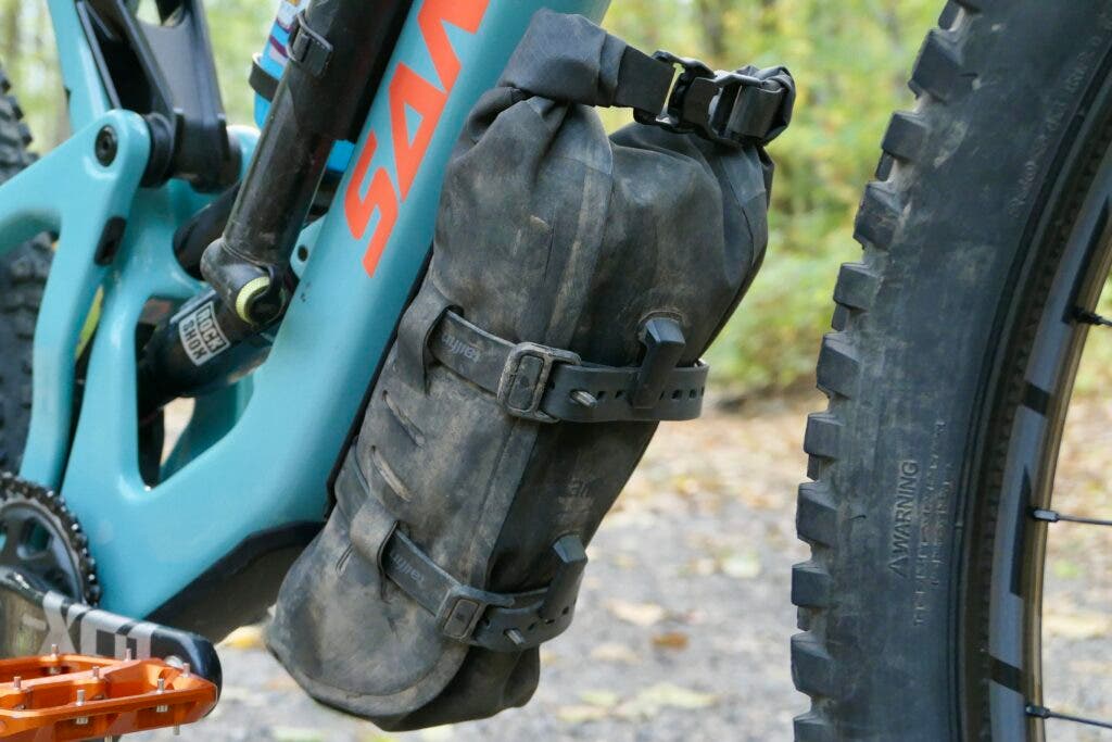On short travel bikes, the space under the seat can be used for stuffing lighter items, such as a sleeping bag and extra clothing and EVOC designed an elegant solution for ratcheting down their Seat Pack BOA bags (from $110). Available in three sizes (size large shown here), it uses the roll-top closure to reduce unused volume and make the pack watertight. Like the handlebar bag, the BOA loop has a rubber looped tab to wrap around the seat post and uses two additional velcro straps to grab onto the seat rails to hold your gear tightly.
