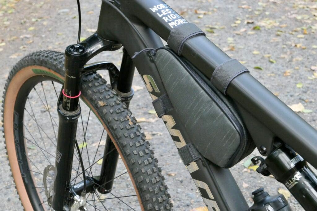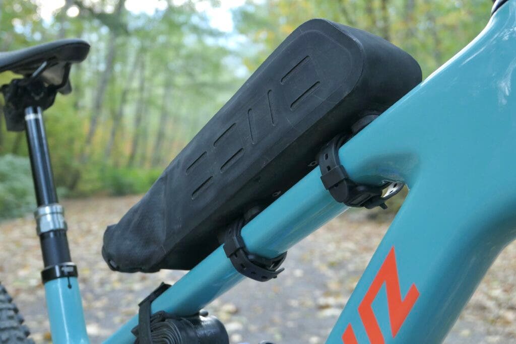 Designed to work with steep or more square top and down tube joints, the one-liter pack is reversible in orientation and uses three straps to cinch down on your frame. Inside, there’s another one to lock down larger items that might rattle on descents. You’ll find a zipper on either side, as well as a port at the front, should you wish to run any cabled lights.