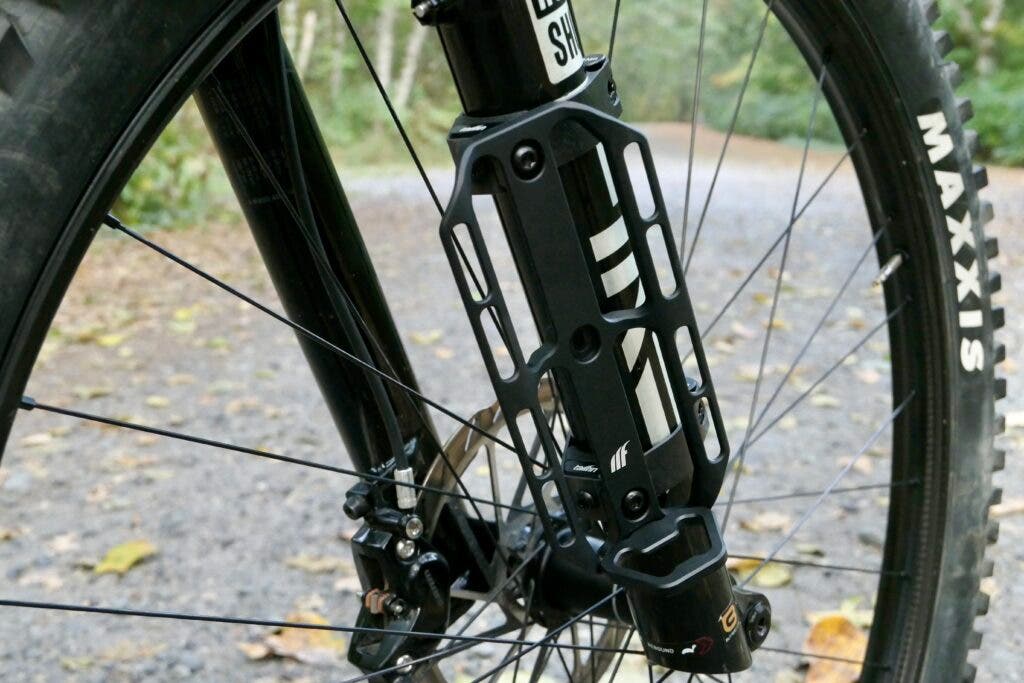 If you’re looking to maximize on-bike storage, the Cargo Cage bolts to carbon ($65) or steel ($40) clamps that wrap around the fork lowers between 37 and 45 millimeters in diameter. You’ll spend $30 more, but save 23 grams per clamp by choosing the fancy carbon clamp. Tailfin states that the loads shouldn’t exceed three kilograms per side for trail riding, or five kilograms for on road use.