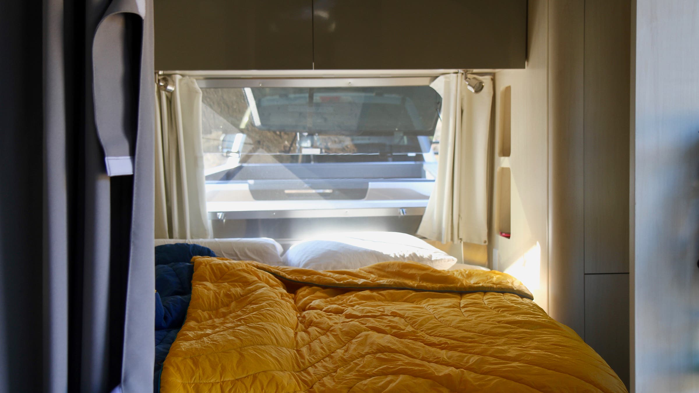 The office is ergonomic and efficient, flooded with light from three windows, and the space feels much bigger than it actually is—a testament to both the expansive views from the desk and good design. The cabinetry is cleverly built, with a bank of drawers and filing cabinets to the left of the desk and a tray table that folds out to make an added workspace. There is also a built-in cubby above the desk that I found useful for storing cables, headphones, and other odds and ends. A comfortable office chair glides atop a plastic floor mat and nests into a secure recessed groove under the desk when not in use. (A strap keeps the chair in place during transit.) The office also has ample lighting, a pop-up USB/AC outlet powered by the onboard battery (even without hookups), and another sound-deadening privacy curtain that would be useful for video calls.