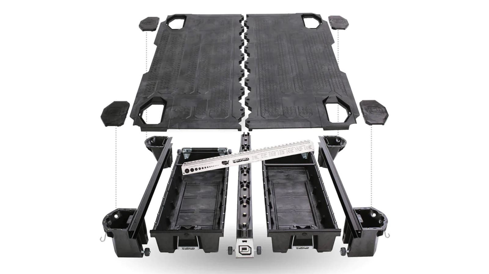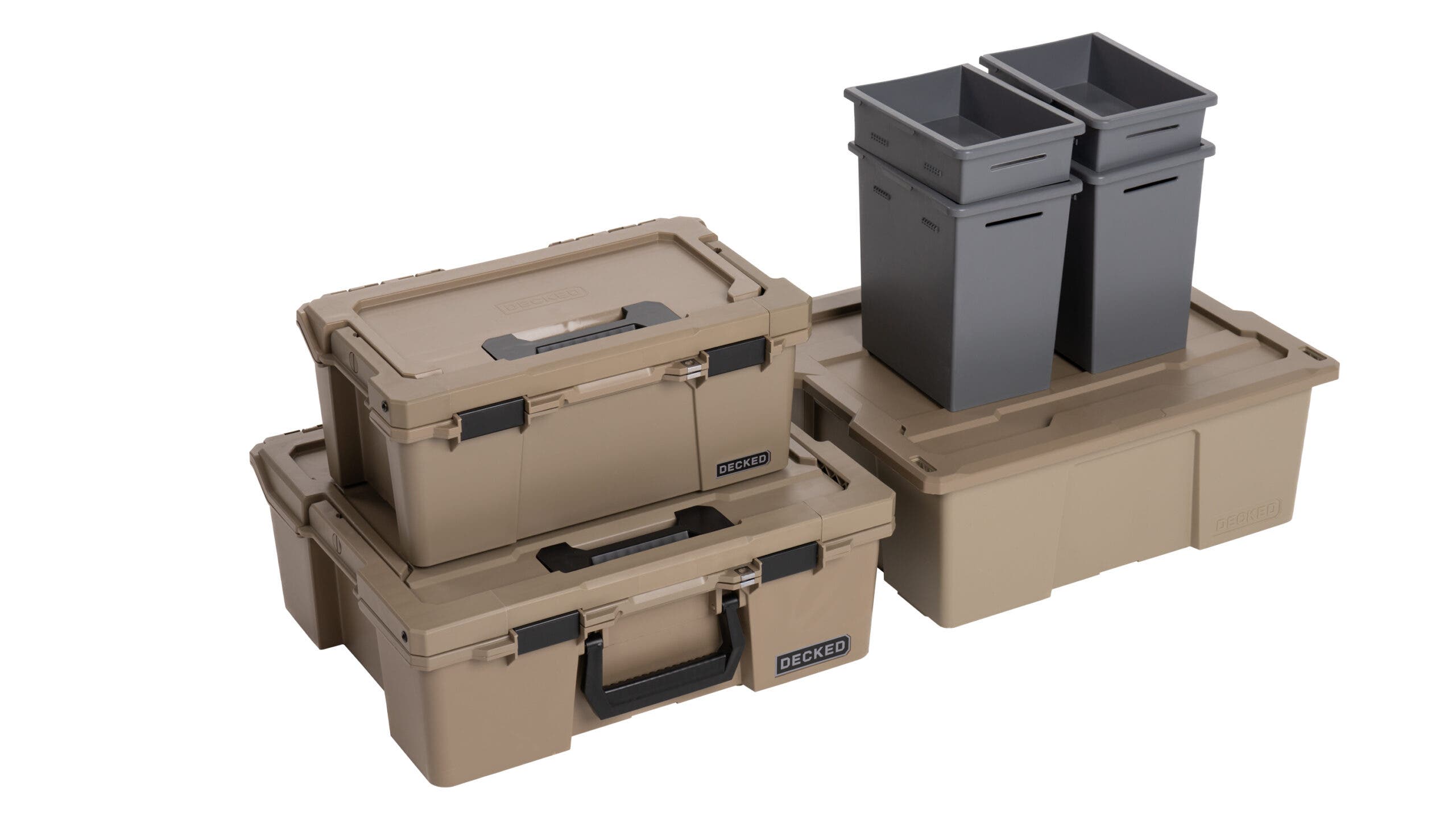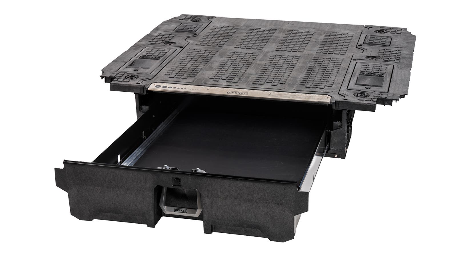 Decked has been around since 2013, and most truck enthusiasts will be familiar with the brand’s recycled high-density polyethylene, made-in-America truck bed drawer systems. That material is virtually indestructible across exposure to weather, chemicals, and impacts, making it perfect for use in the back of a pickup, but molding it into elaborate shapes is complicated. So, compared to weaker, less weather-resistant drawers constructed from plywood, the old Decked systems sacrificed a lot of space.